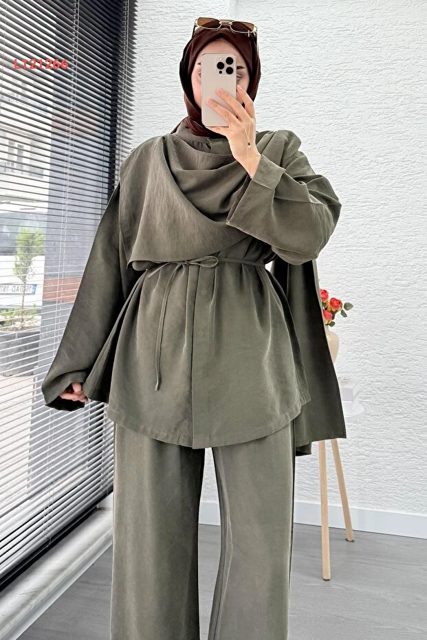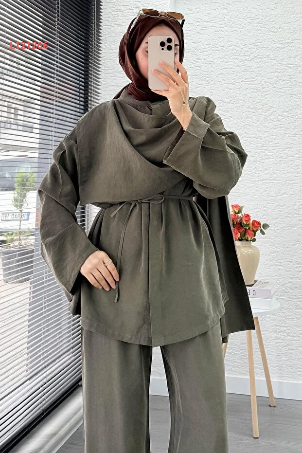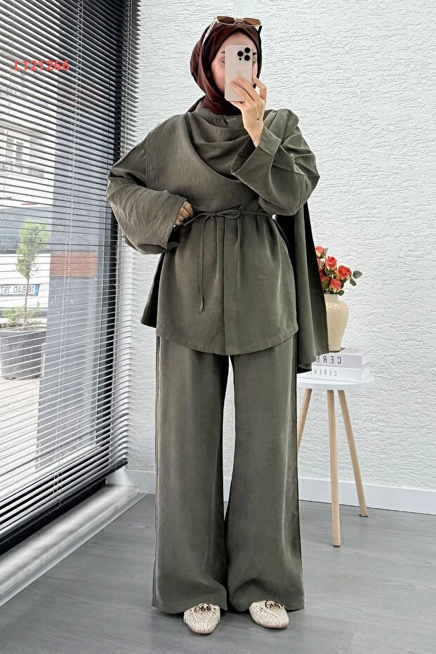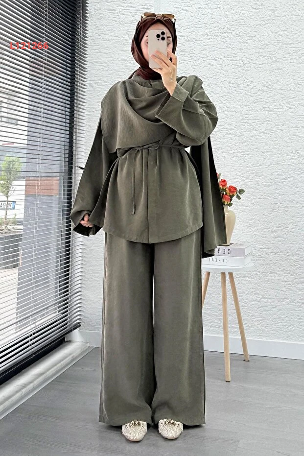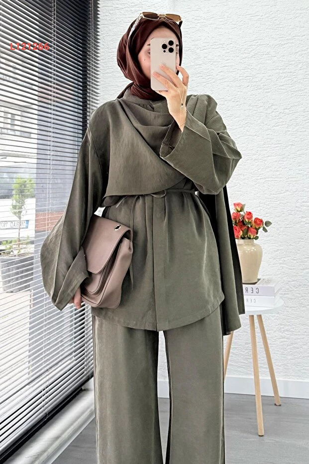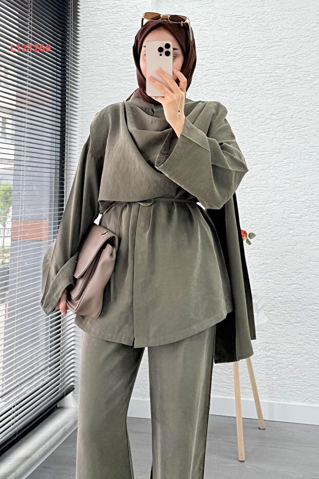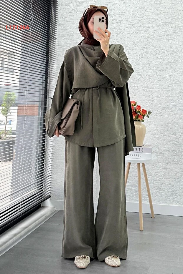 بدلة نسائية ثنائية فاخرة من MELEK ARAZ - حزامي - لون حاكي