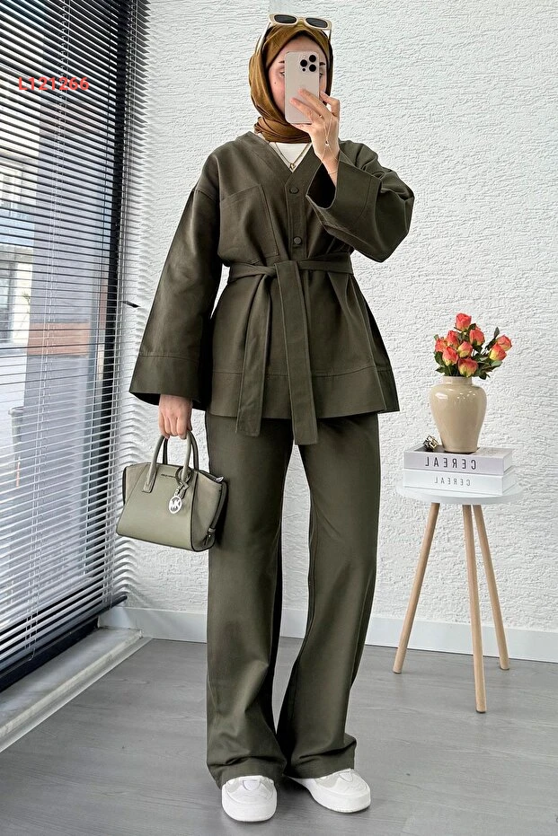طقم جاباردين مكون من قطعتين بفتحة على شكل حرف V - زيتوني