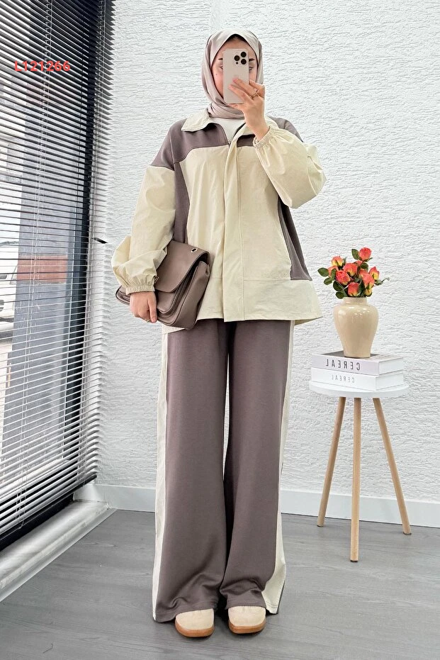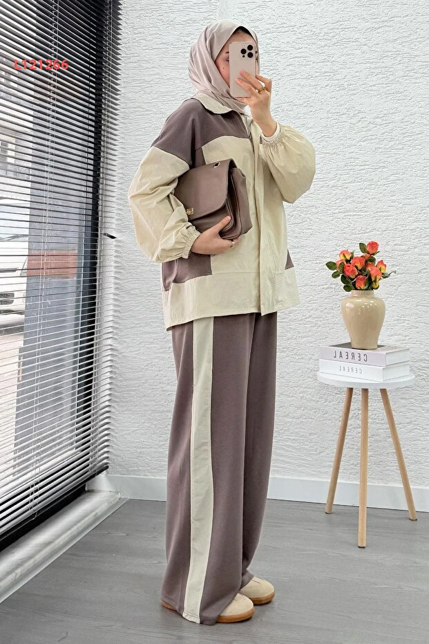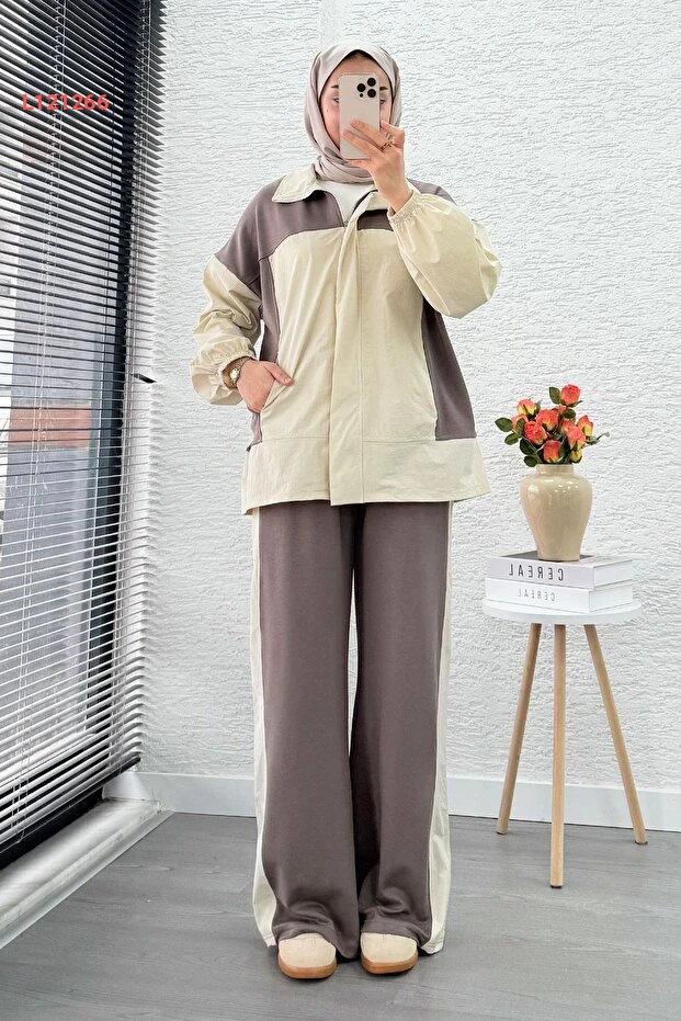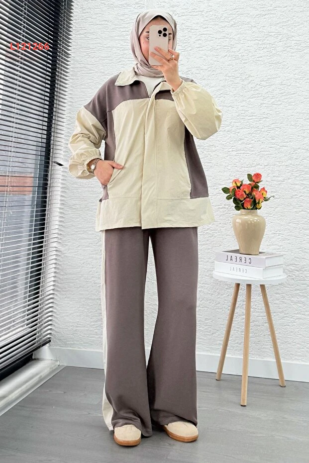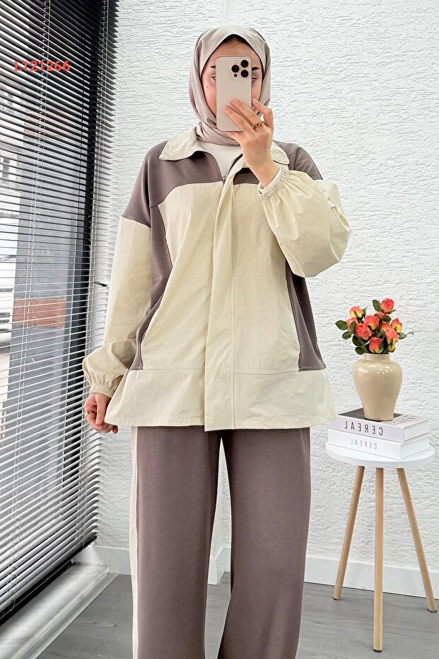 طقم إسوستر ثنائي مع جينات باراشوت بسحاب - لون البيج