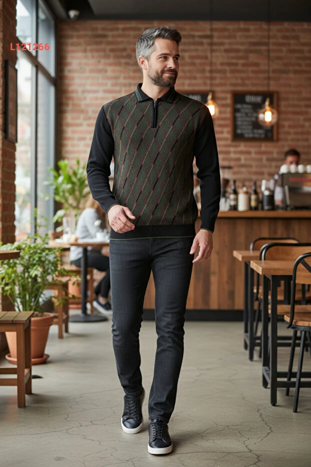 سترة كسر الصوف للرجال بياقة بولو - تصميم متميز ومضاد للتقشر باللون الأسود