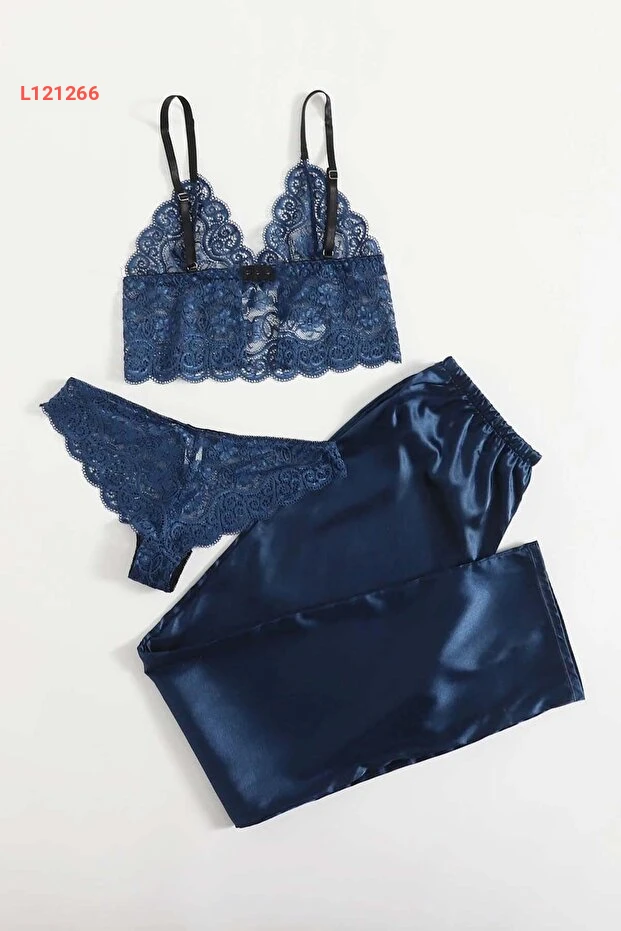 طقم بيجاما ساتان ثلاثي مرمر من ميري سي مع حمالة صدر ودانتيل