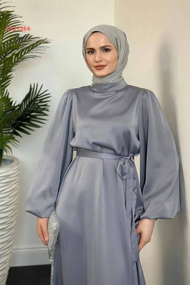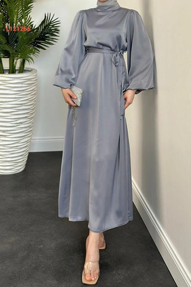 فستان ساتان بأكمام بالون رمادي من مرفن أكيوز - ديميترا