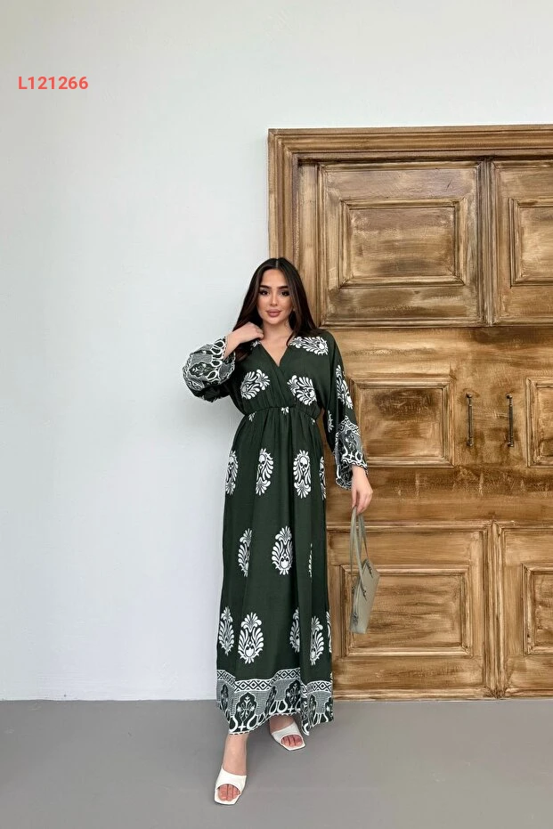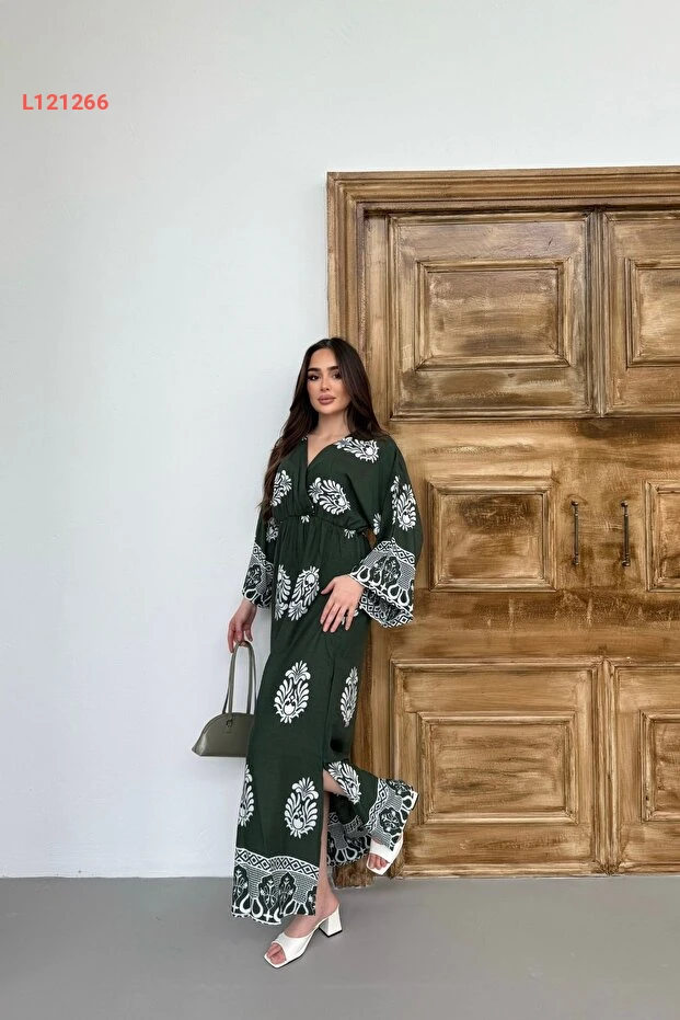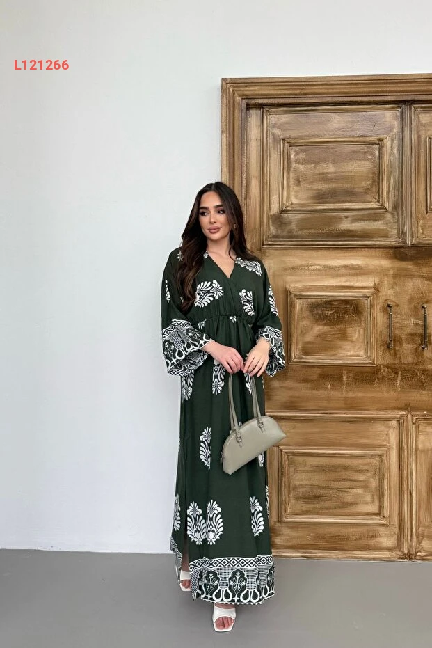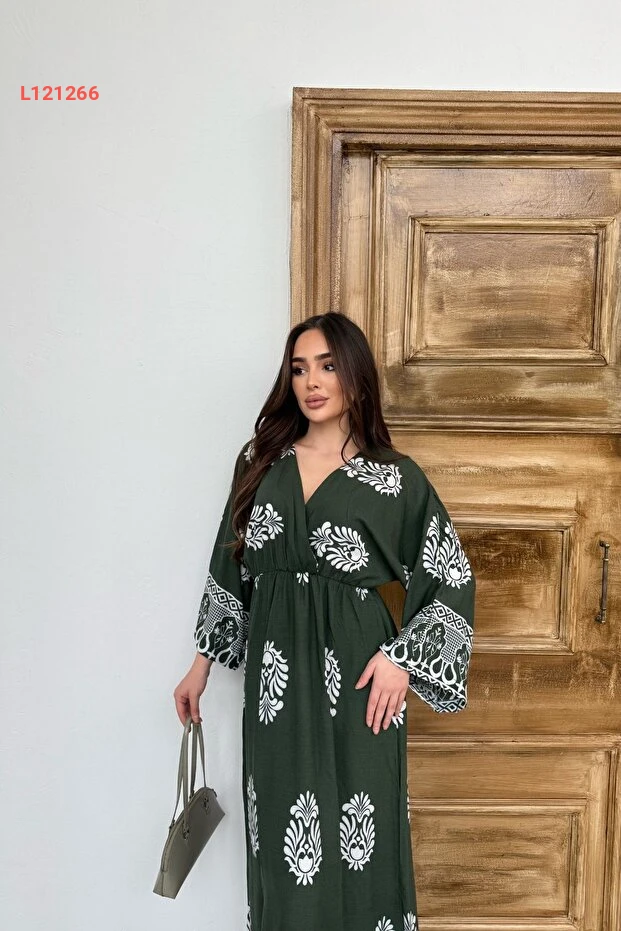 فستان برقبة طويلة مزخرف بتصميم تقليدي باللون الأخضر