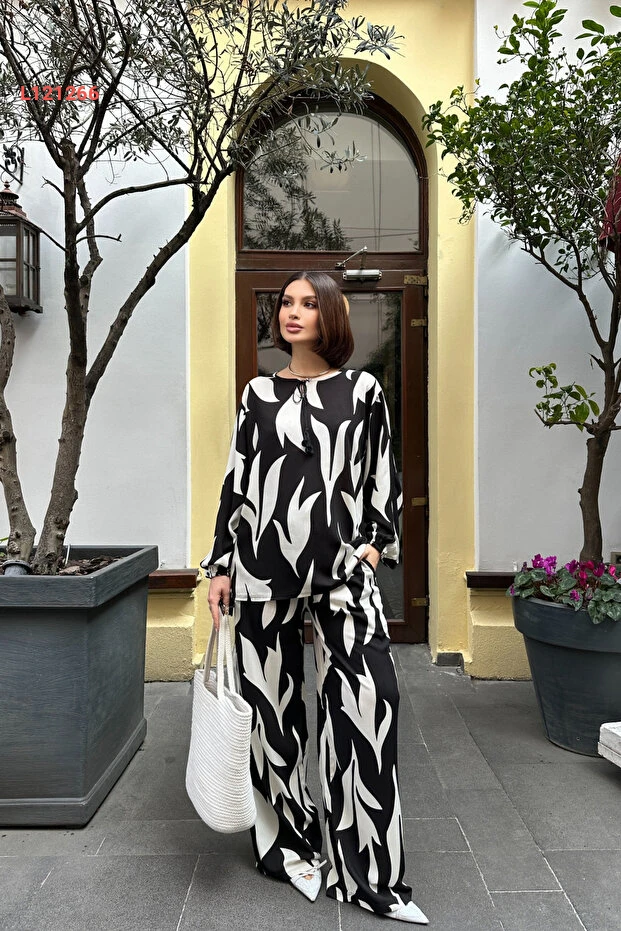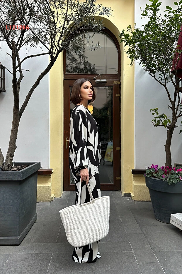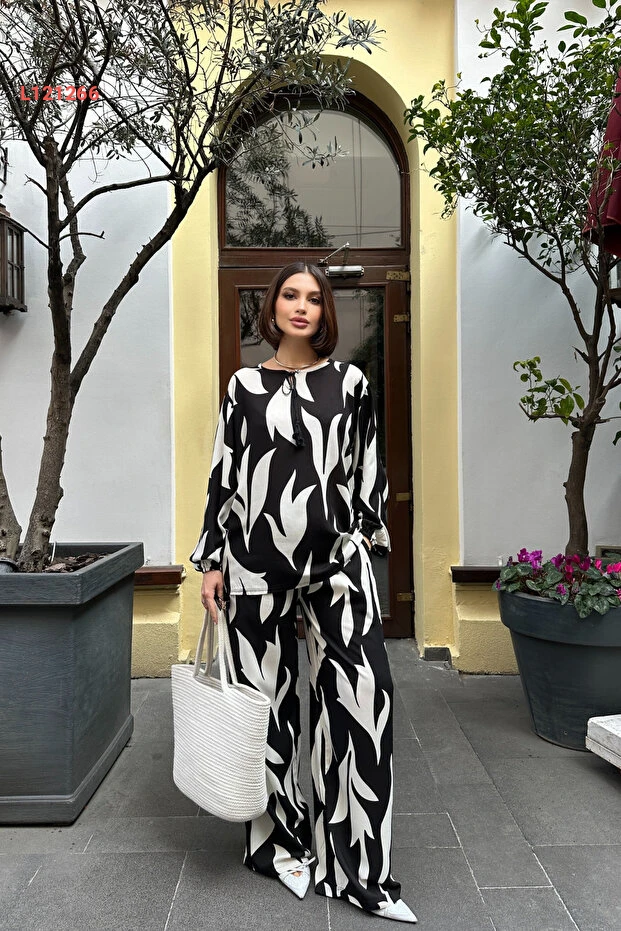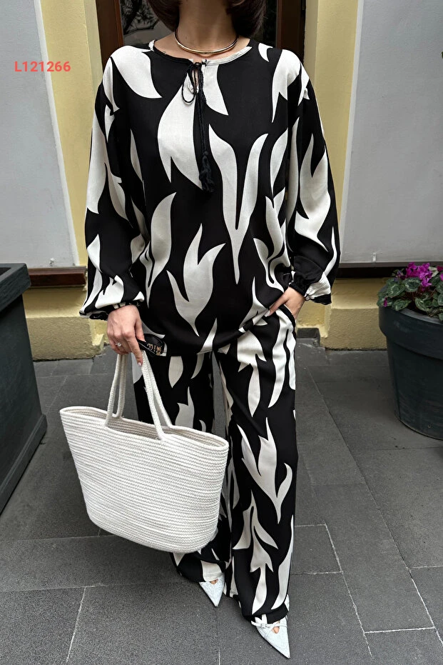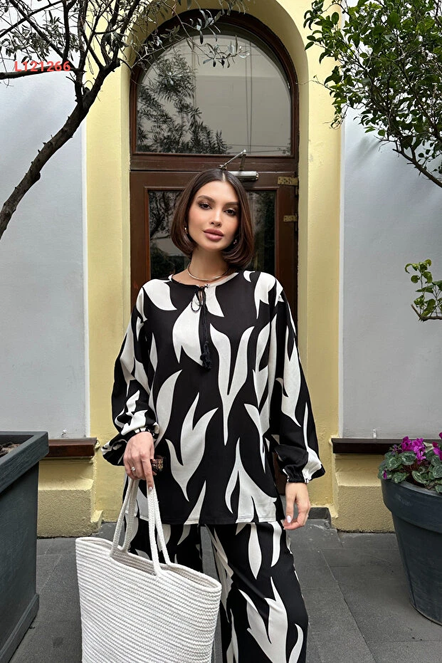 مجموعة نسائية مكونة من توب وسروال مزخرف بالأبيض والأسود مع رباط عنق