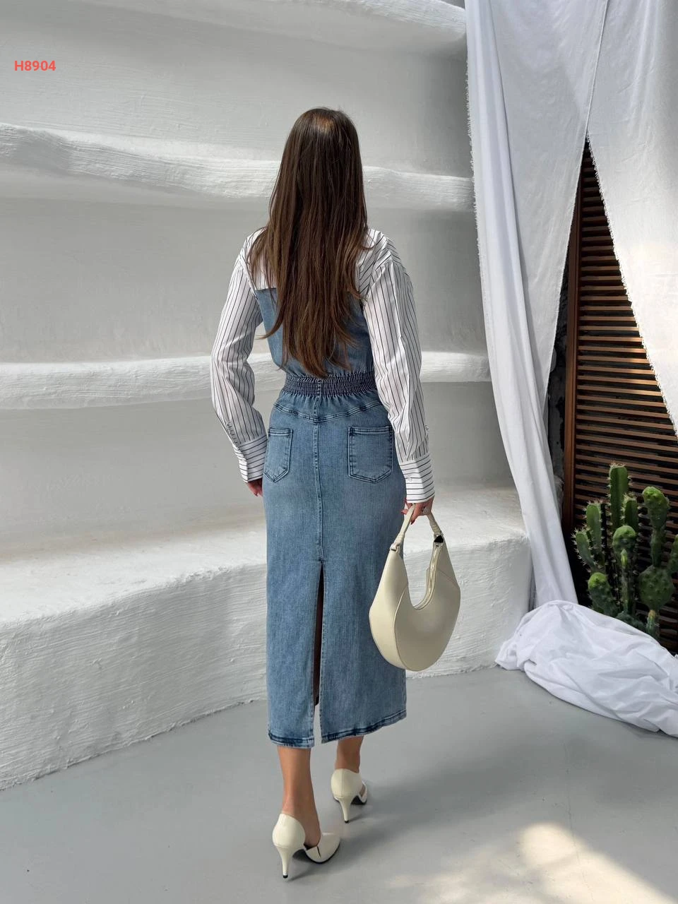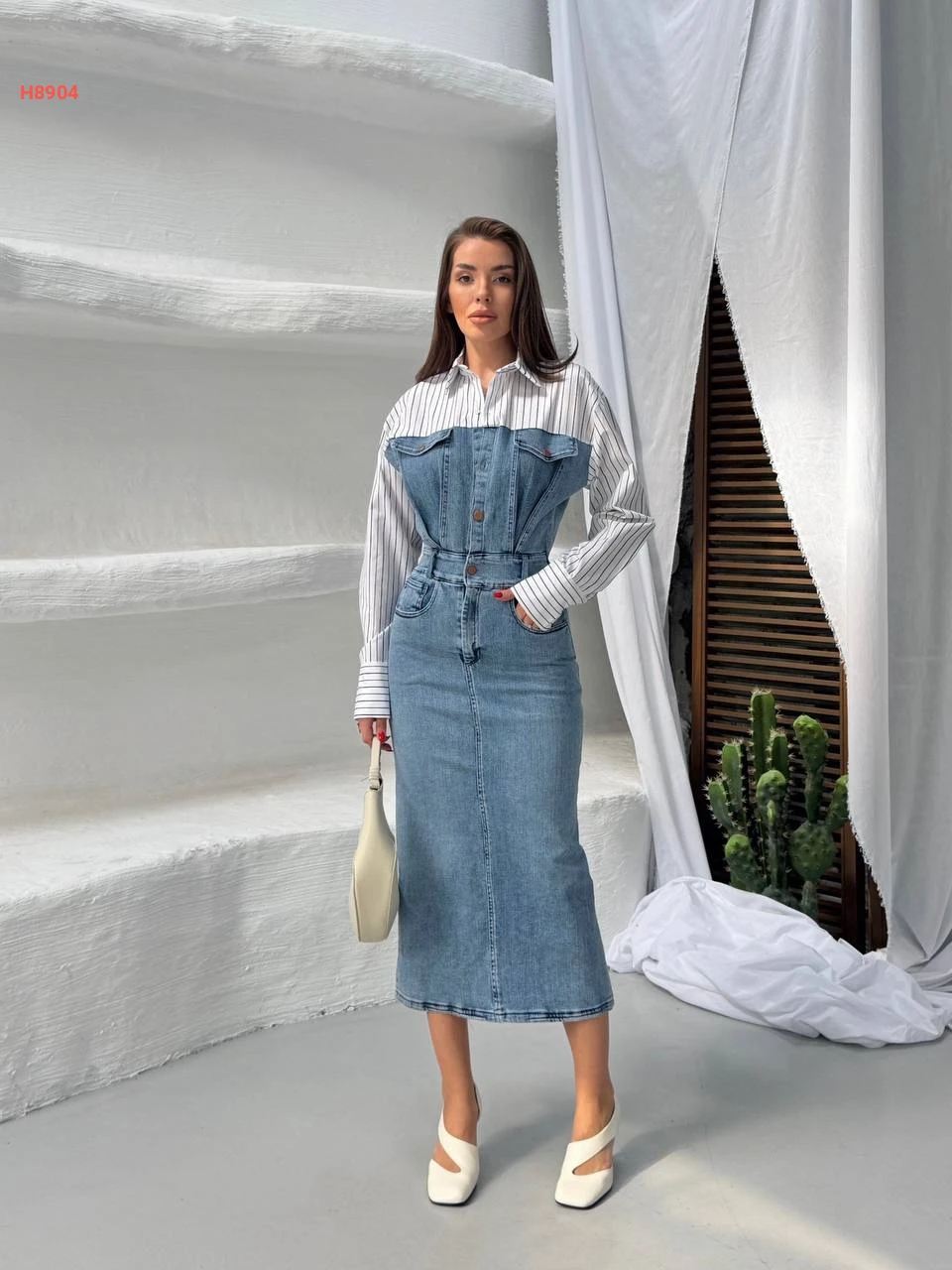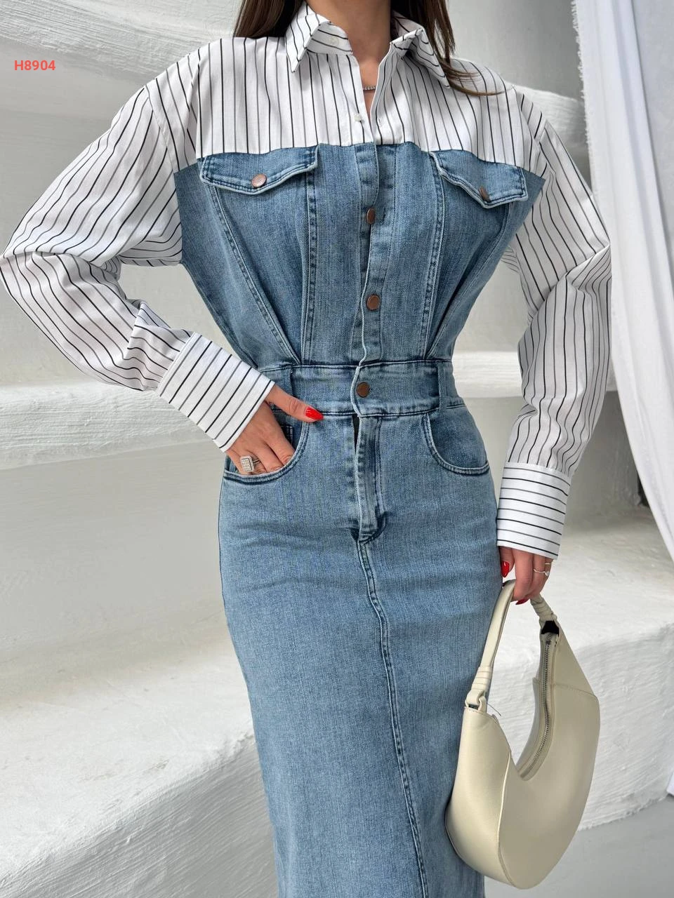 فستان جينز ميدي بأكمام وياقة قميص