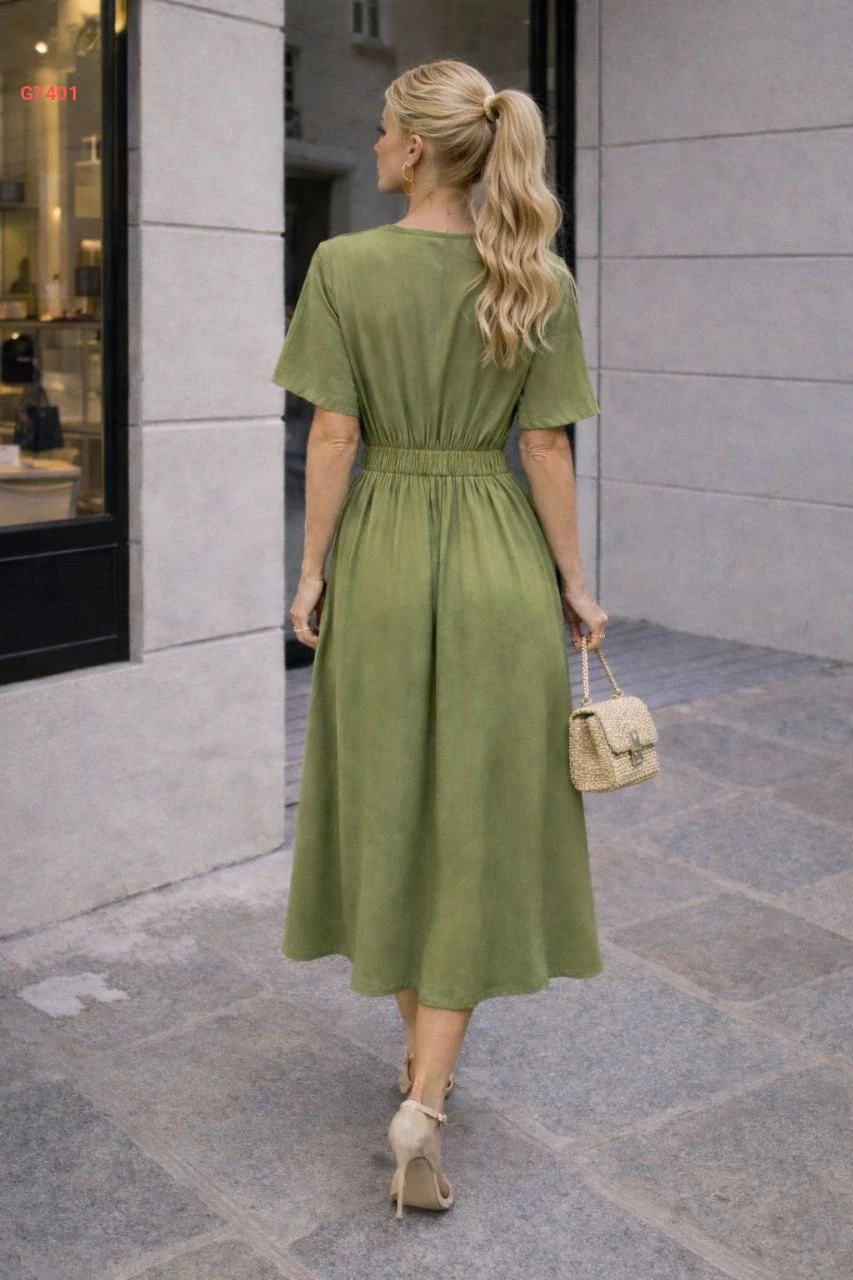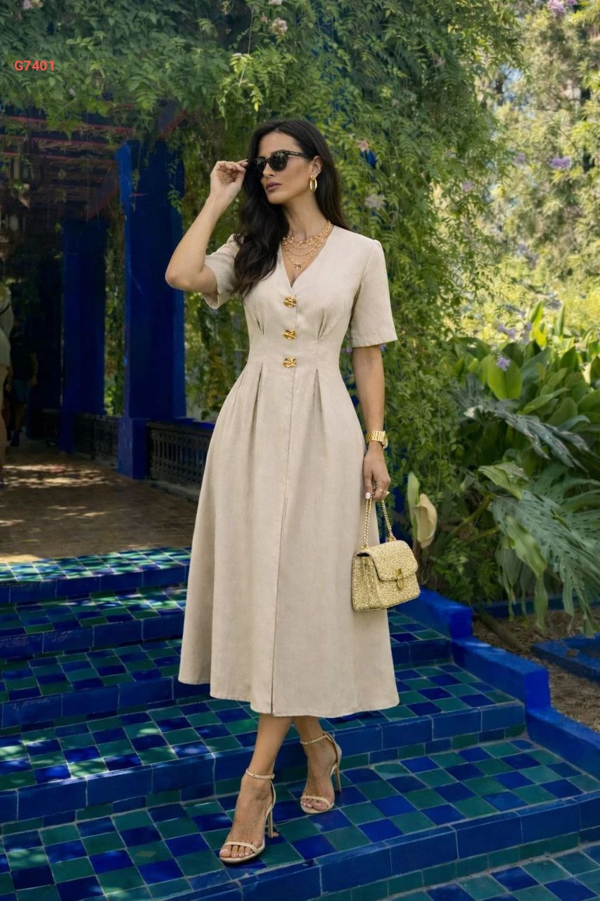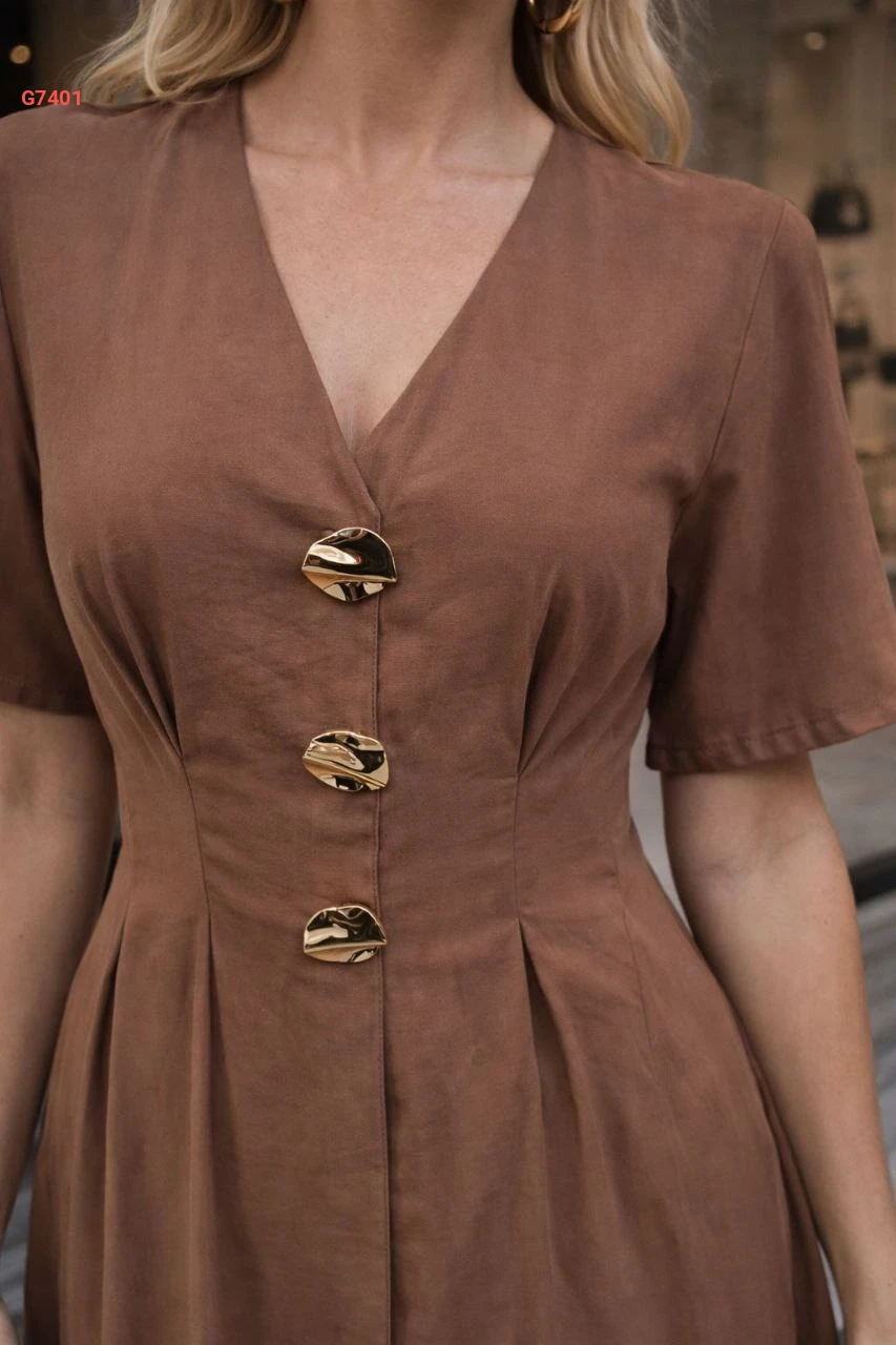 فستان ميدي باكسسوار دهبي وأكمام قصيرة