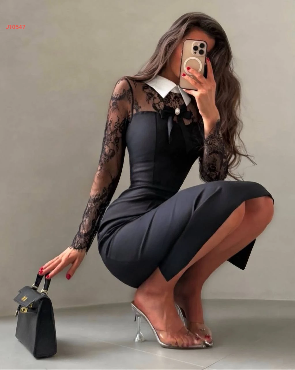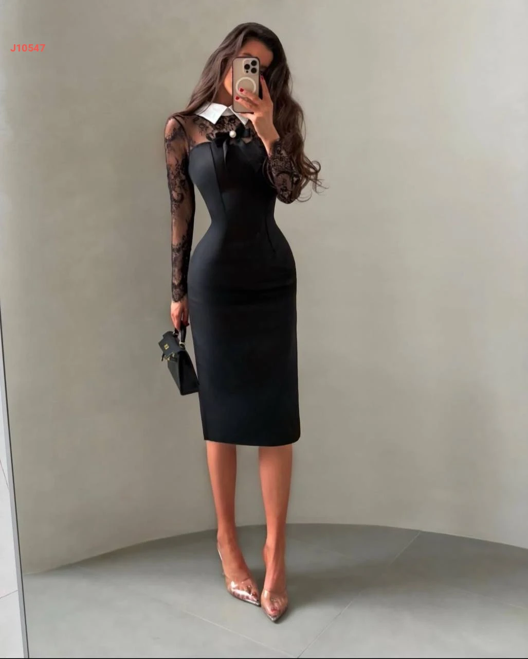 فستان ميدي بأكمام دانتيل وبروش فيونك
