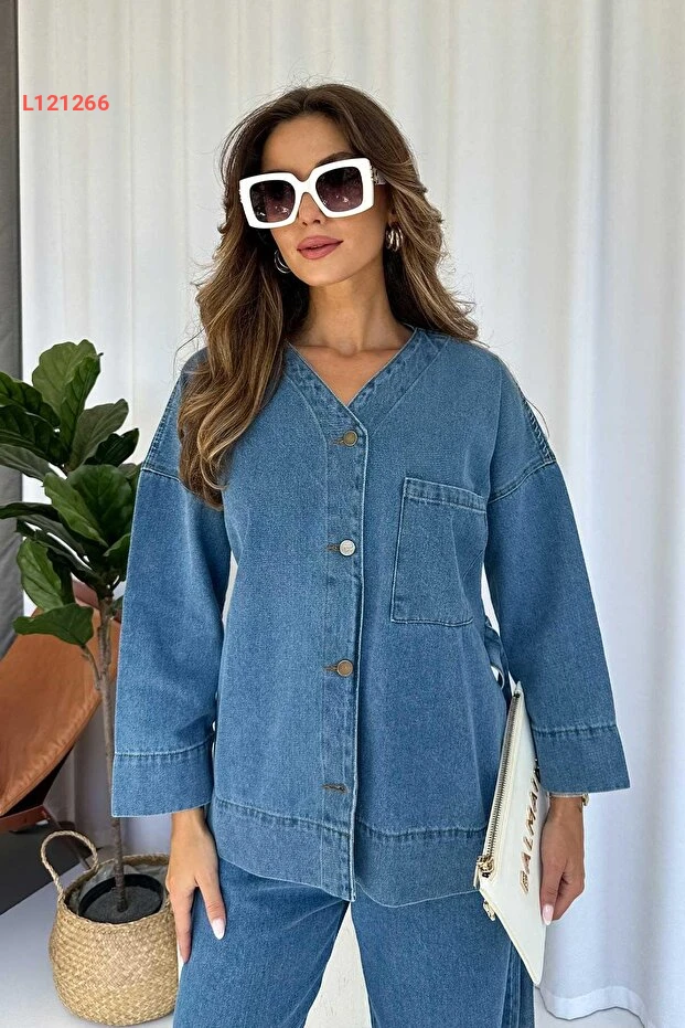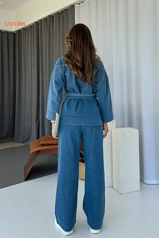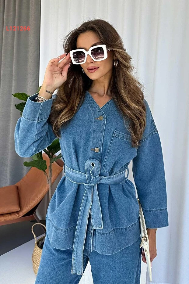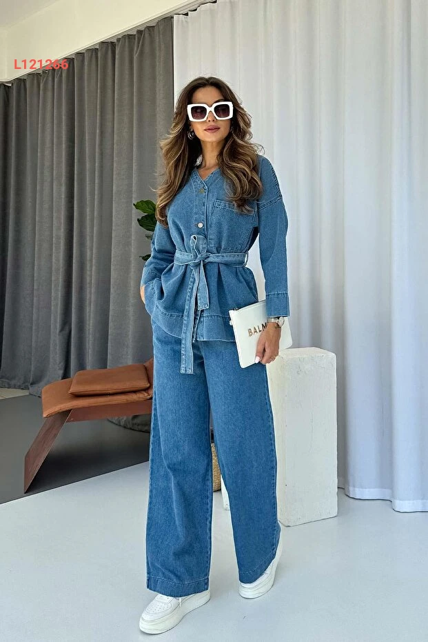 طقم نسائي من قميص وسروال جينز بياقة على شكل V وحزام عند الخصر - أزرق فاتح