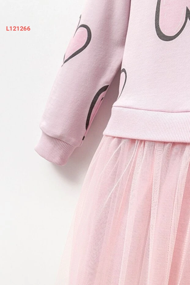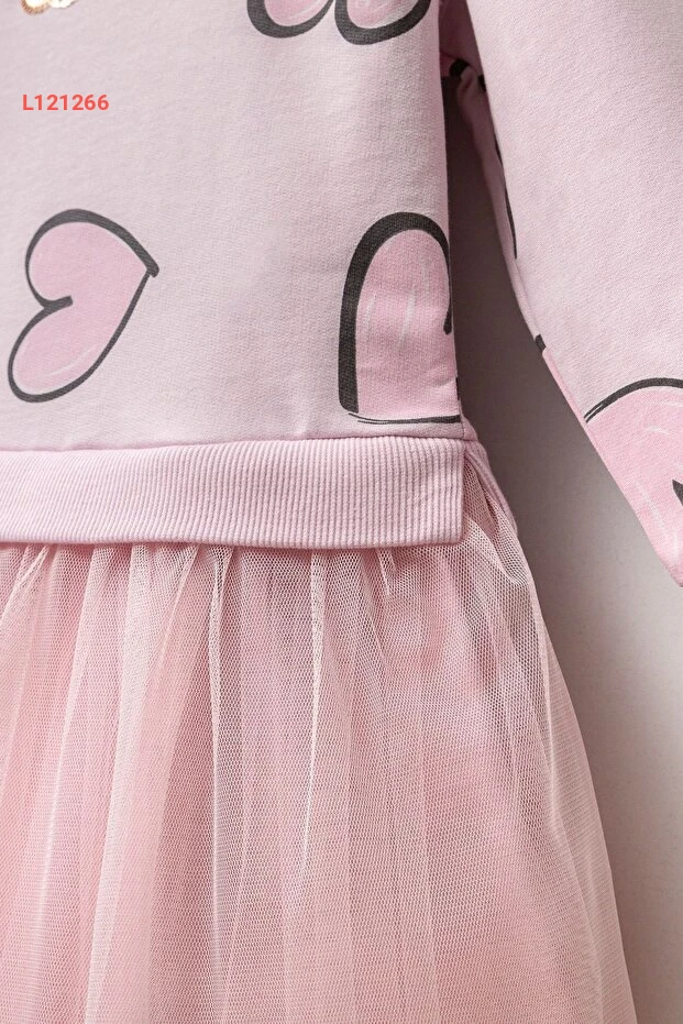 فستان بناتي طويل الأكمام من قماش القطن 100% مع تزيين التول – للأعمار من 4 إلى 7 سنوات