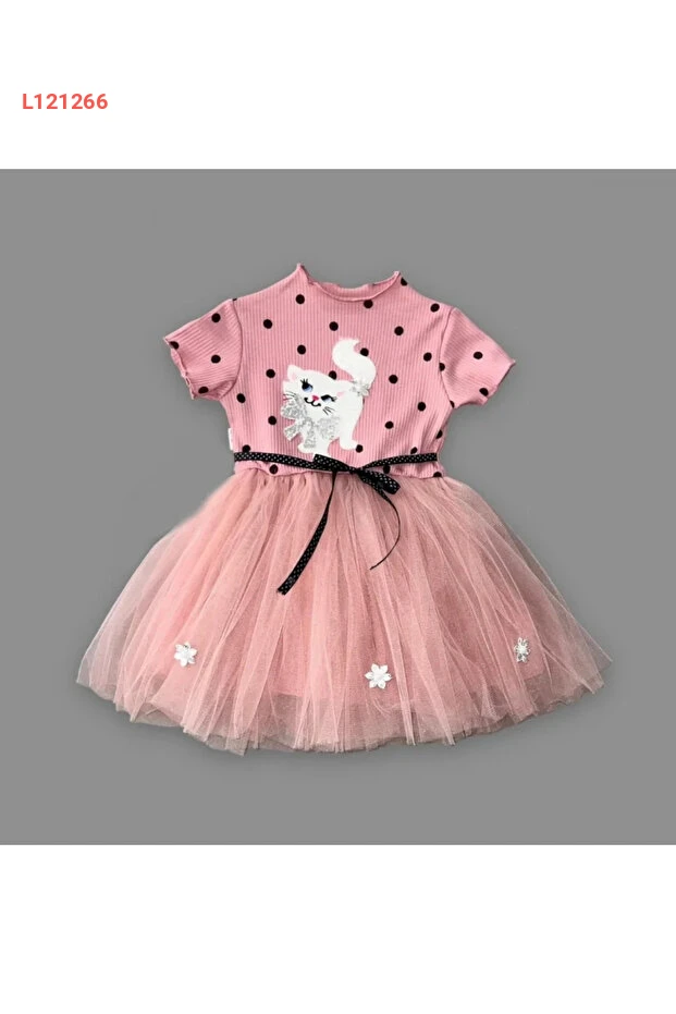 فستان بنت للمولود بحبيبات دنتيل وطبعة قطة - لون وردي غامق
