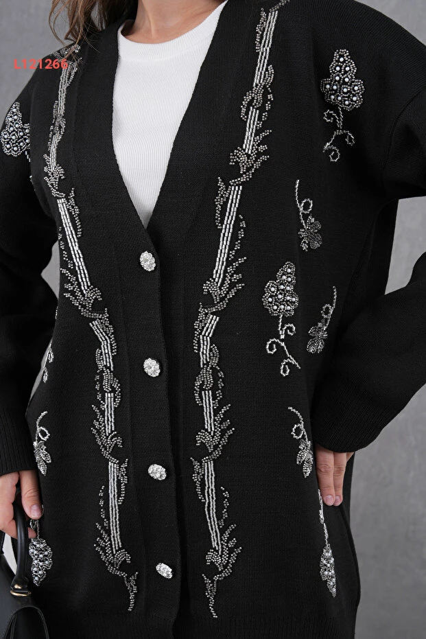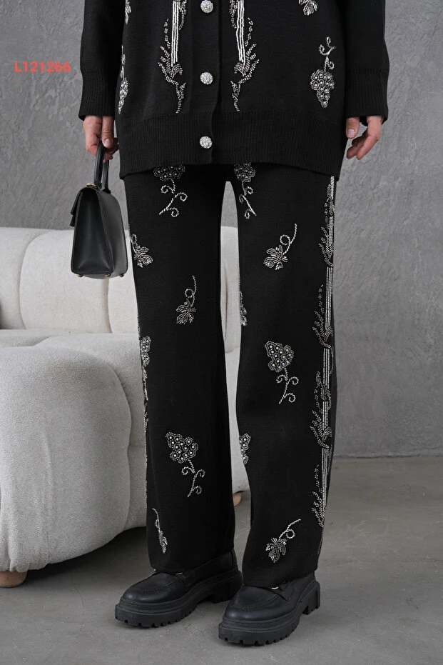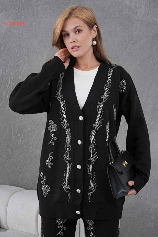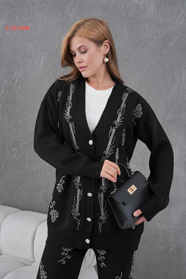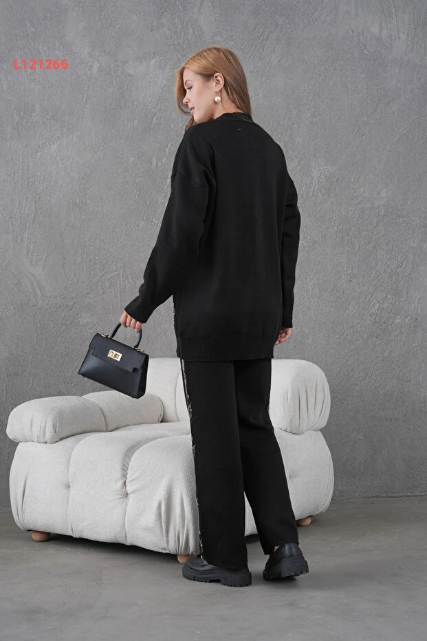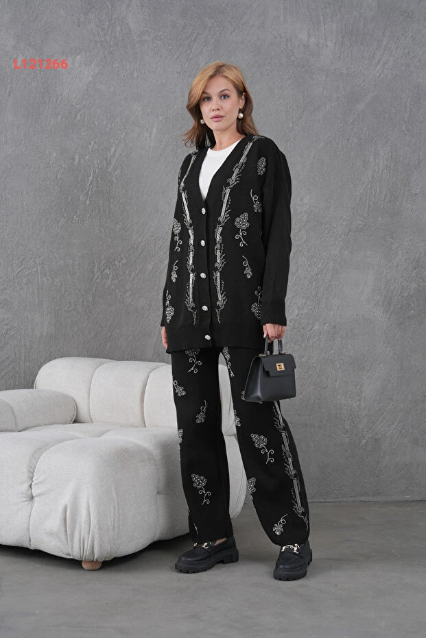 استمتع بأناقة مريحة مع مجموعة Miss Allos، التي تضم سترة محبوكة واسعة مزينة بتفاصيل من الكريستال وبنطلون متناسق. تجمع هذه الإطلالة بين الجاذبية والراحة، مما يجعلها الخيار المثالي للتألق في المناسبات اليومية أو الجلسات المسائية. ارتديها واعتبري كل يوم مناسبة خاصة!
