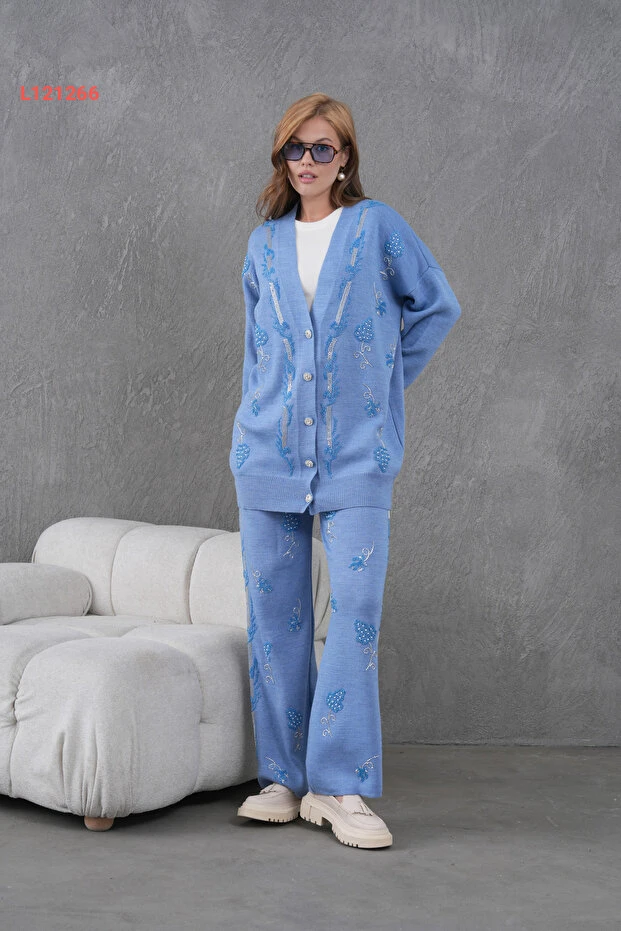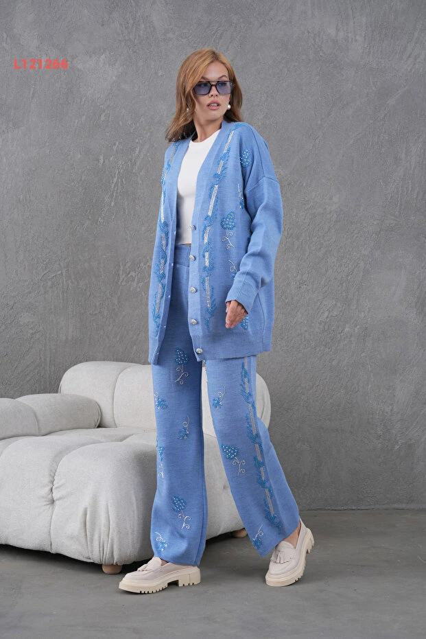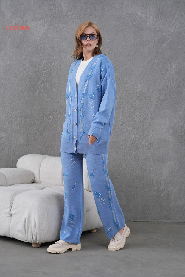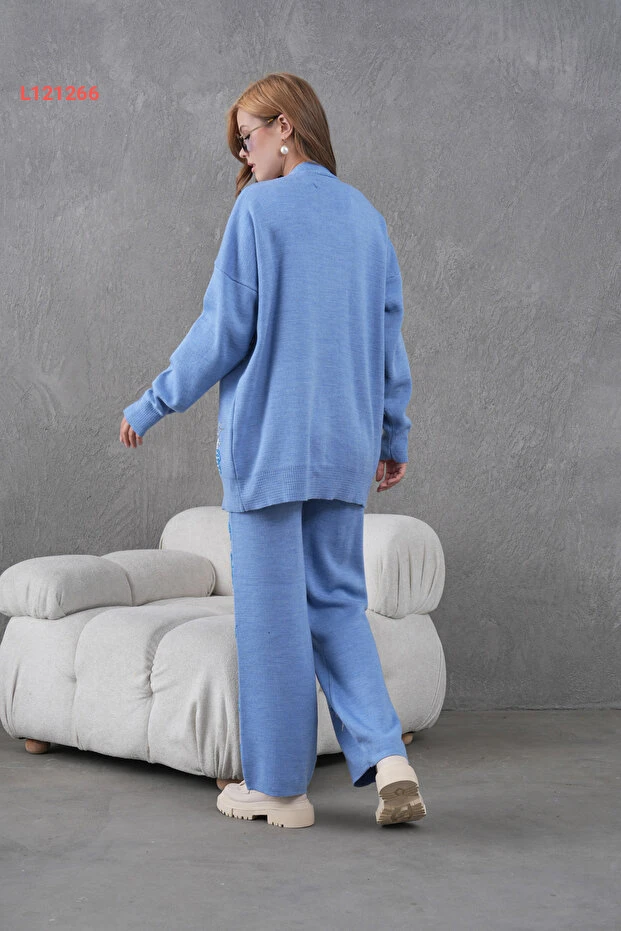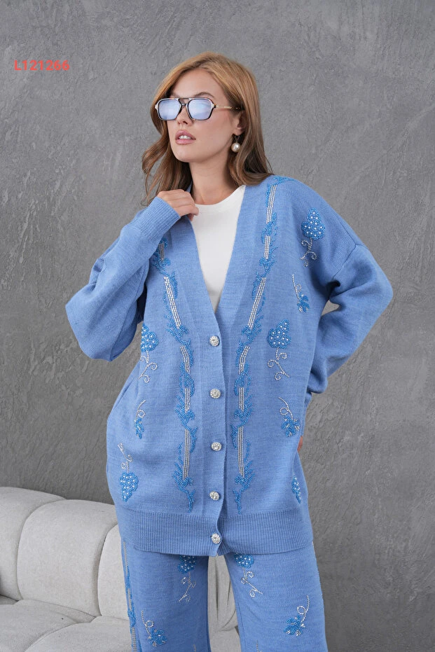 طقم تريكو نسائي بقلادات من ميس أليوس - كارديغان وسروال واسع