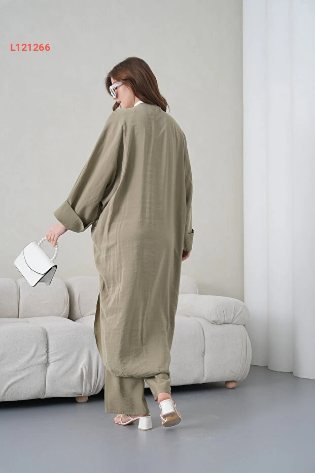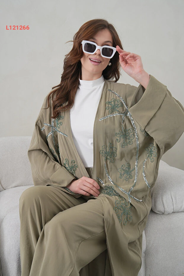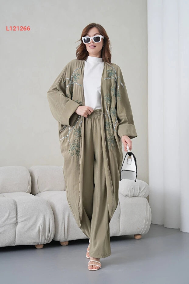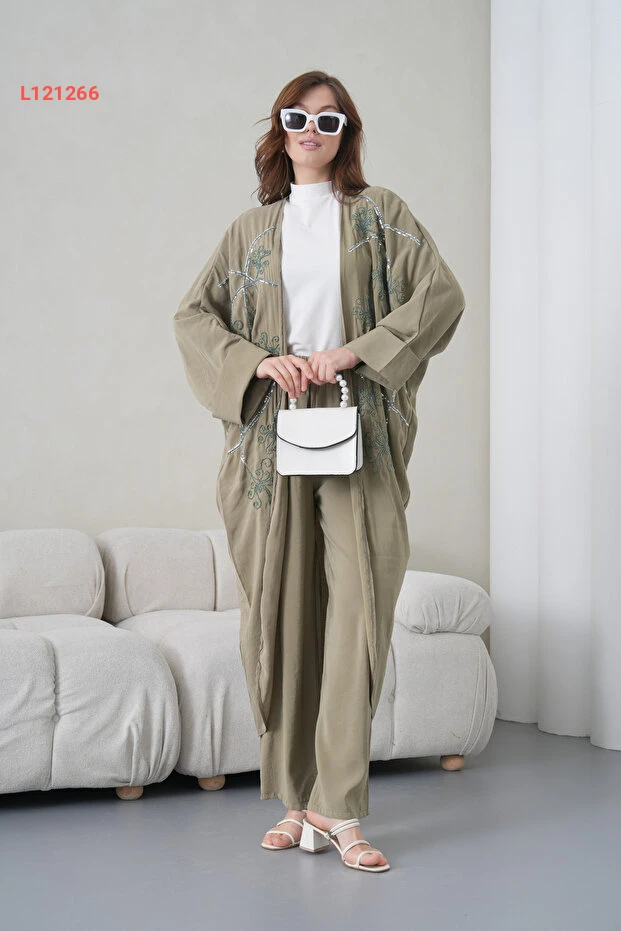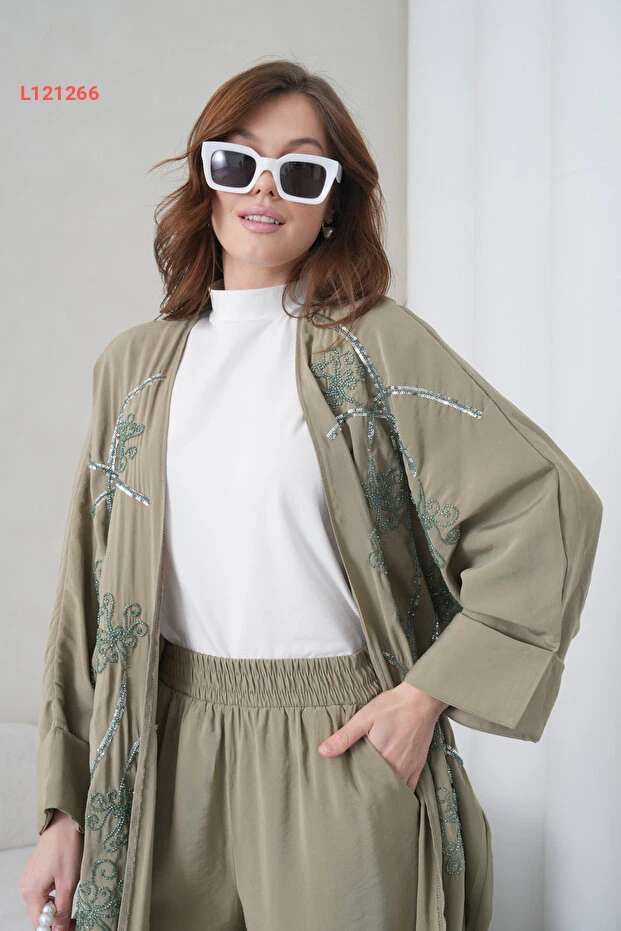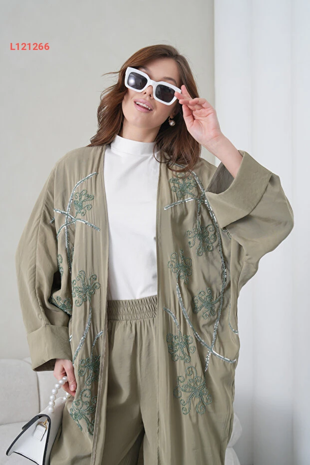 استمتعي بإطلالة أنيقة ومريحة مع طقم الكيمونو والبنطلون من Miss Allos، المصنوع من القطن الفاخر. يتميز الكيمونو بتطريزات رائعة وخرز لامع يضفي لمسة من الأناقة، ما يجعله الخيار المثالي لمختلف المناسبات. يجمع هذا الطقم بين الراحة والتصميم العصري، مما يجعلك تبرزين بأناقة لا مثيل لها!