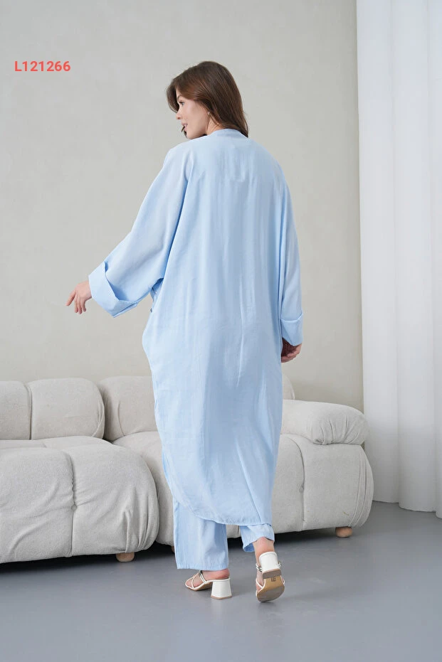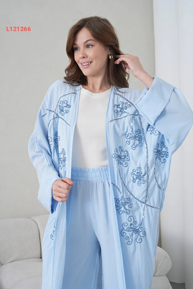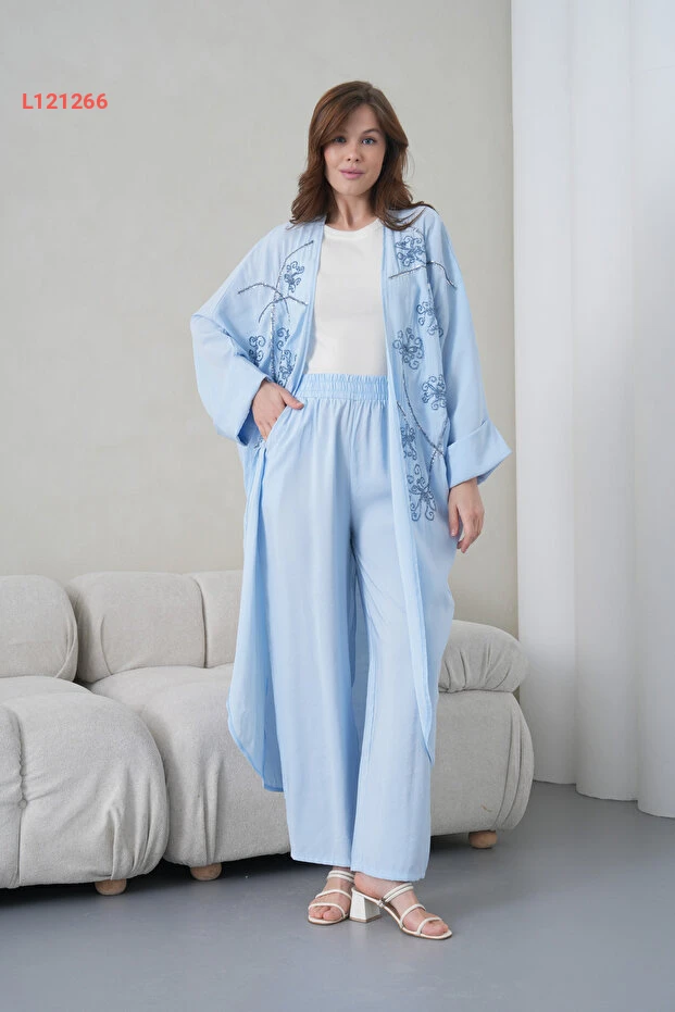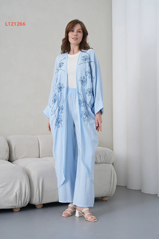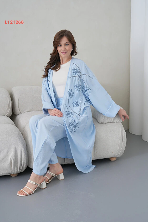 اكتشفي الأناقة والراحة مع طقم الكيمونو والسروال من Miss Allos، المصنوع من الكتان الفاخر. يتميز بخياطة دقيقة وطبعات مميزة على المقدمة، مما يضيف لمسة فنية رائعة إلى إطلالتك. استمتعي بمظهر عصري يجمع بين الأناقة والراحة في كل مناسبة!