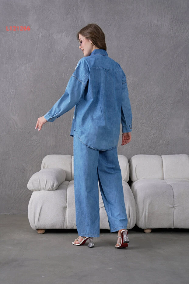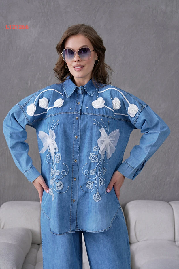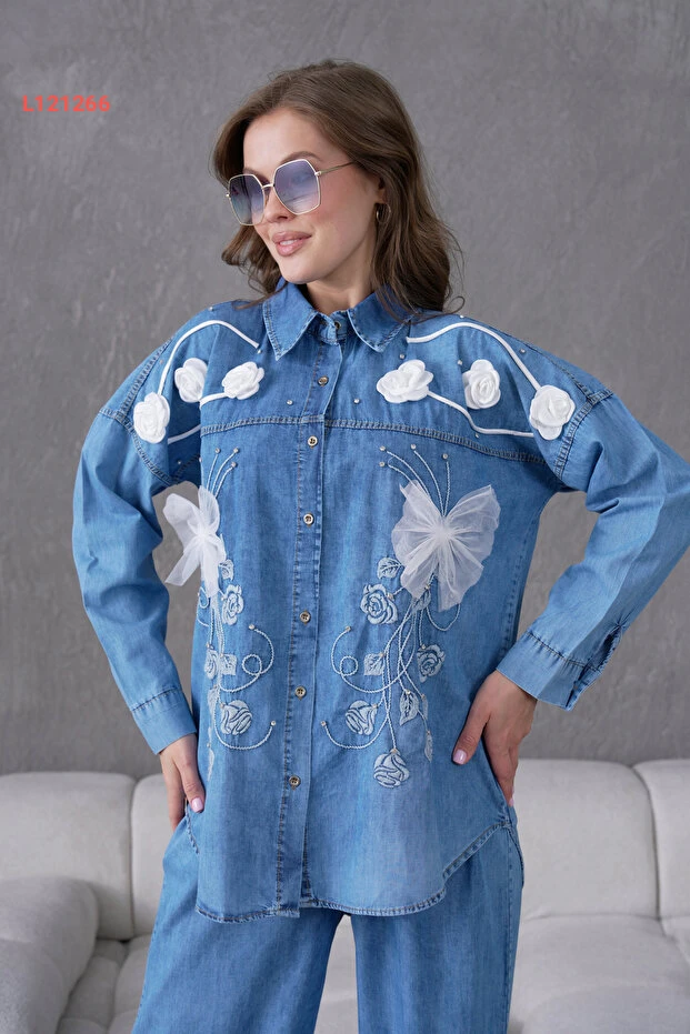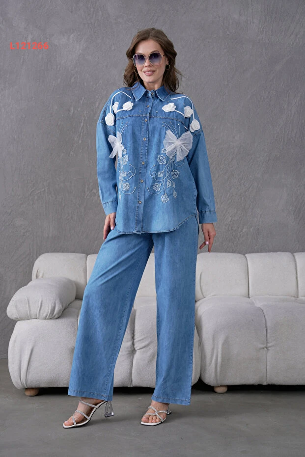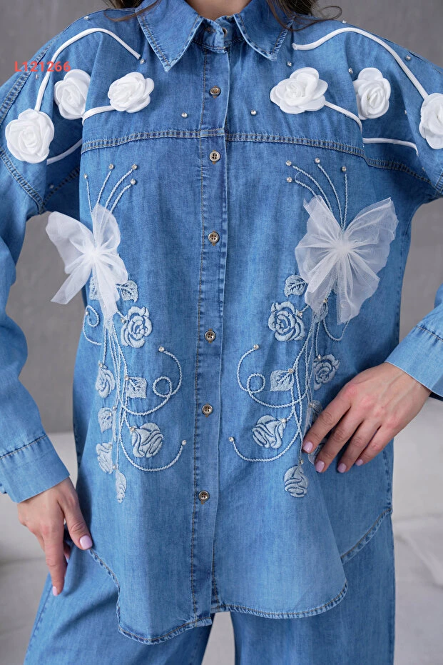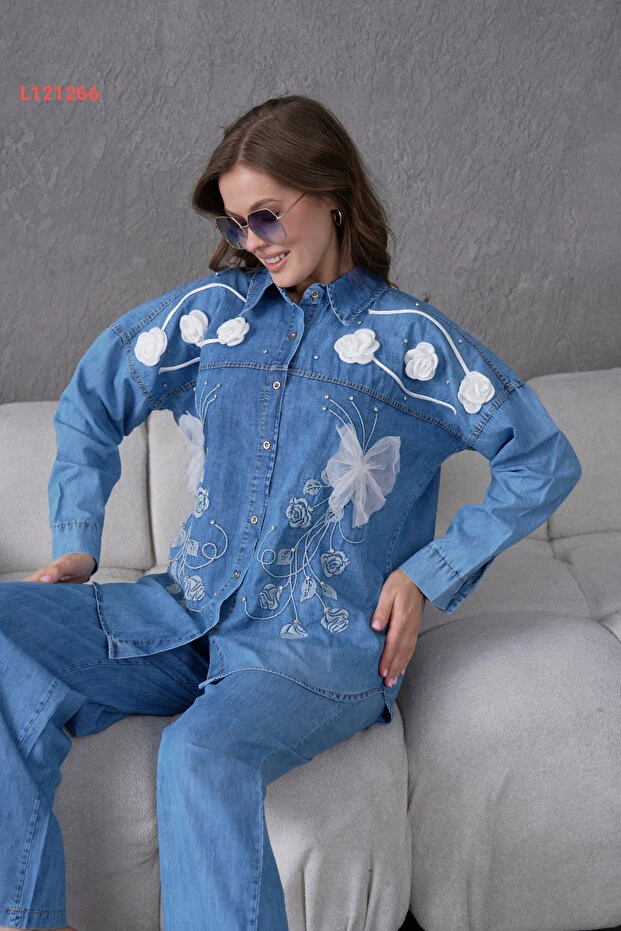 اكتشفي أناقتك مع طقم "Miss Allos"، الذي يجمع بين قميص الجينز المزخرف بزهور رقيقة وتفاصيل راقية من الأحجار، مع بنطال جينز يلائم كل المناسبات. تصميمه العصري مع لمسة من الأنوثة يضمن لكِ إطلالة مميزة ومريحة، ما يجعله الاختيار المثالي لكل امرأة تبحث عن الجمال والراحة في آن واحد.