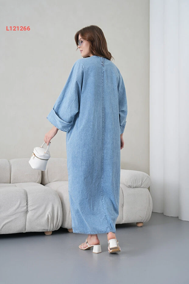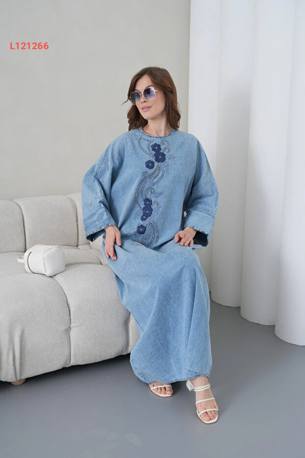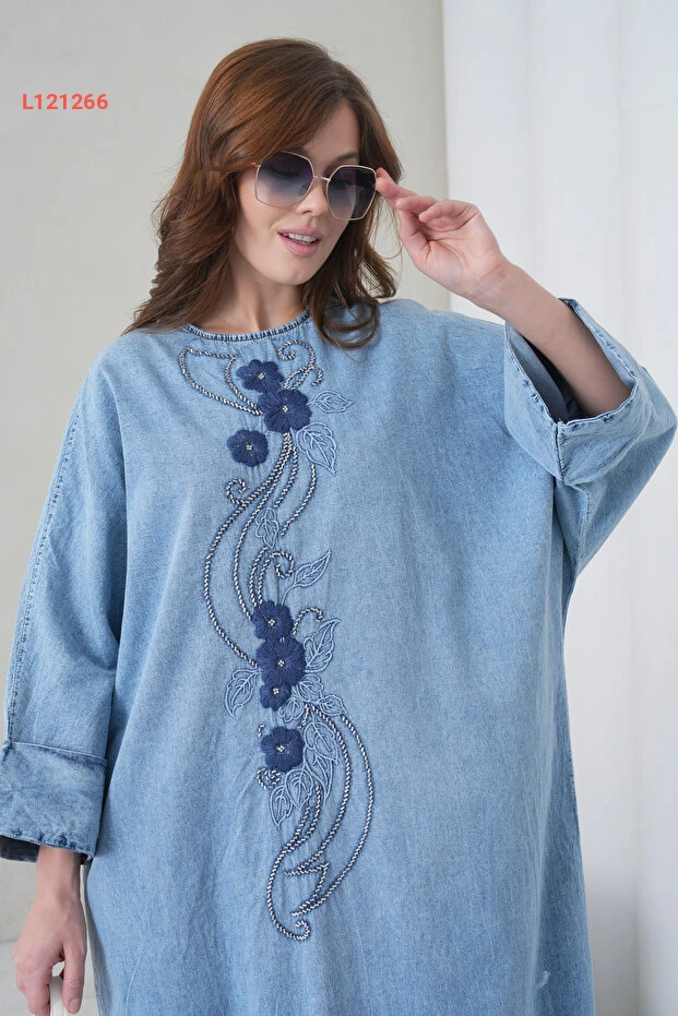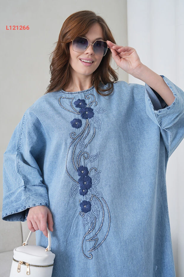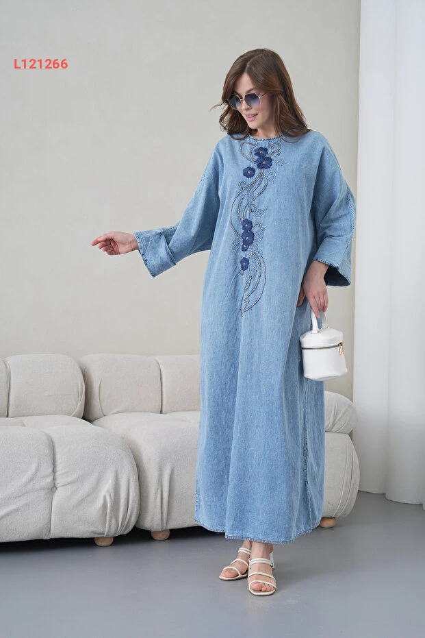 فستان جينز طويل للنساء بتصميم واسع مع تطريز وأزرار ملونة من ميس أُولُوس