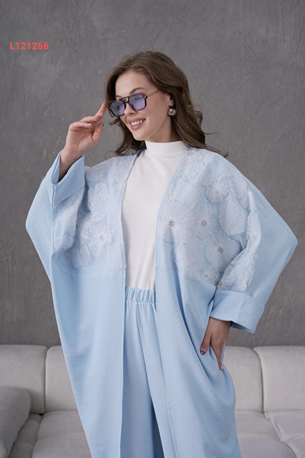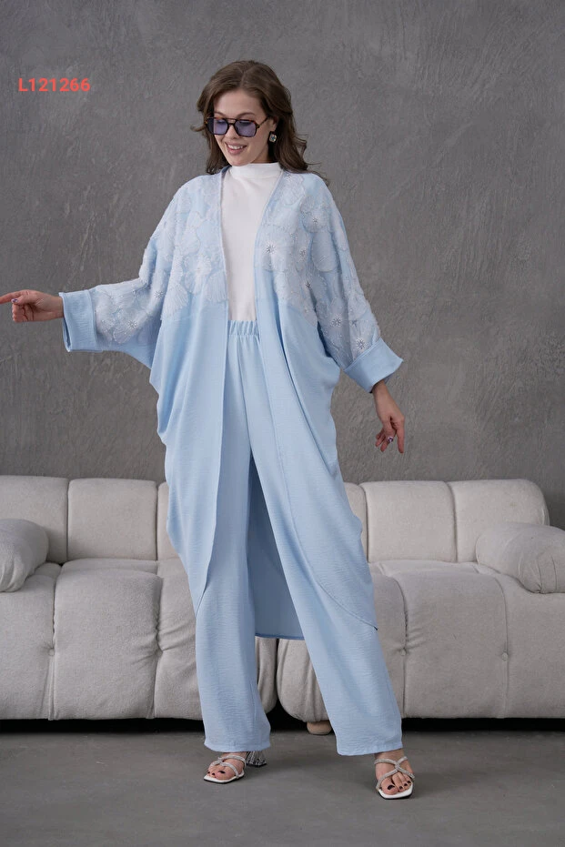 كيمونو هيركاء وبنطلون مزين بتفاصيل من الدانتيل والخرز واللؤلؤ من ميس ألوص للنساء