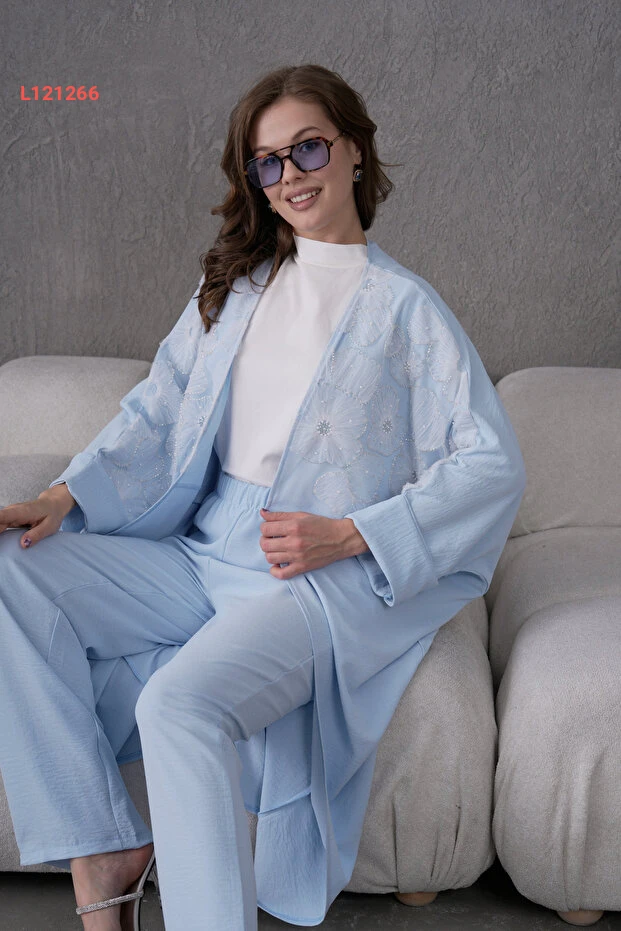 تألقي بإطلالة أنيقة ومميزة مع طقم كيمونو وفستان Miss Allos المكون من الحماية الفائقة والتفاصيل الرائعة. يتميز بتطريز الأزهار الرقيق والترتر والبروكس، مما يضفي لمسة من الرفاهية على إطلالتك. صُمم بأقمشة كتان ناعمة لضمان الراحة والأناقة في كل مناسبة.