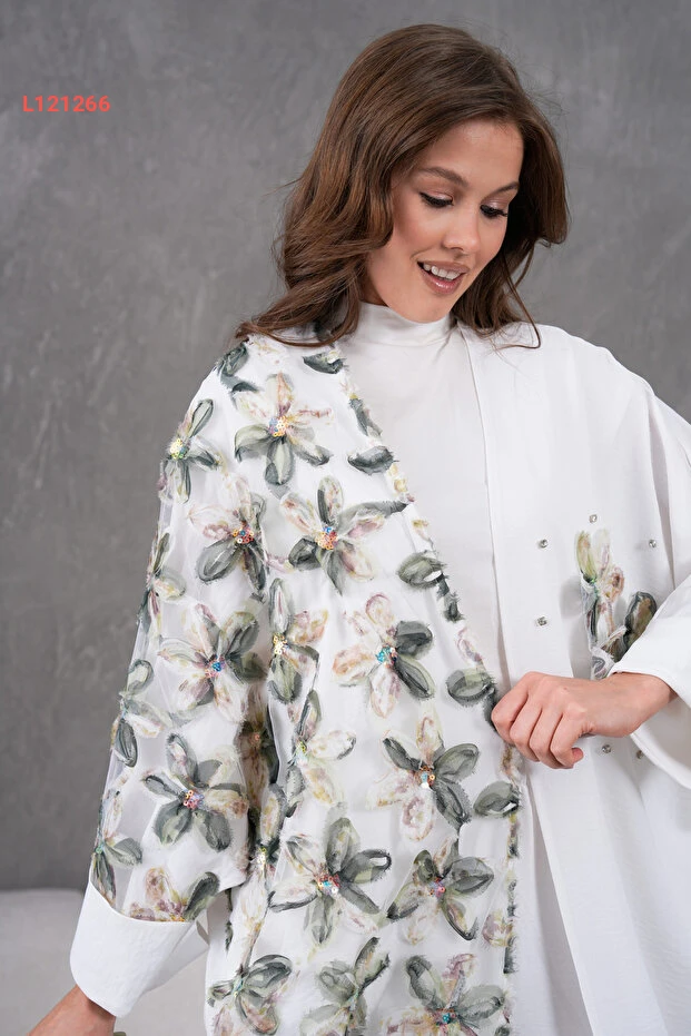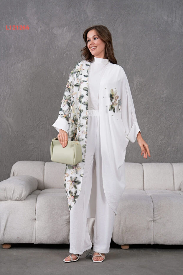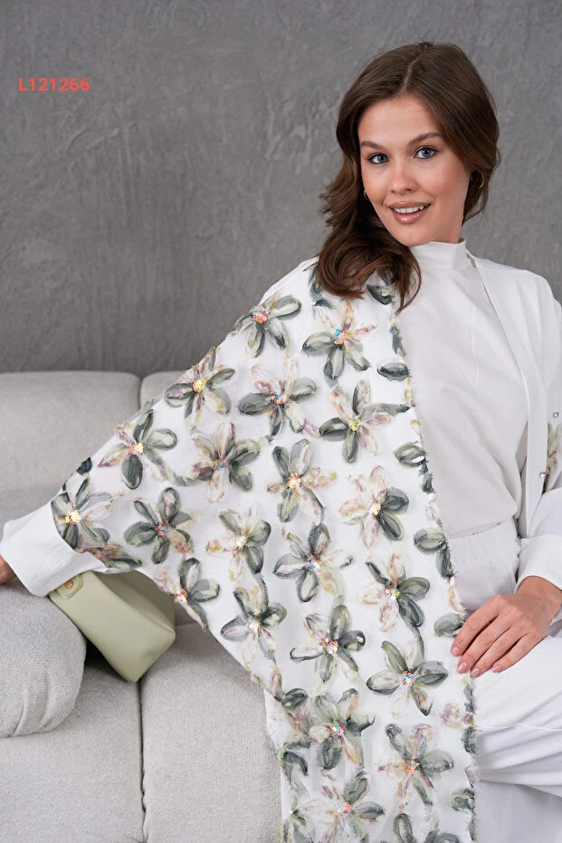استمتعي بالأناقة المطلقة مع طقم "Miss Allos" الذي يتكون من كيمونو وسروال مزين بتفاصيل رائعة من الدانتيل وزهور مطرزة. يتميز هذا التصميم الفاخر بتفاصيل الحجر اللامعة التي تضفي لمسة من الفخامة، مما يجعله الخيار المثالي لمناسباتك الخاصة أو للإطلالات اليومية المتميزة. اجعلي نفسك محط الأنظار مع هذا الطقم الذي يجمع بين الراحة والأناقة.