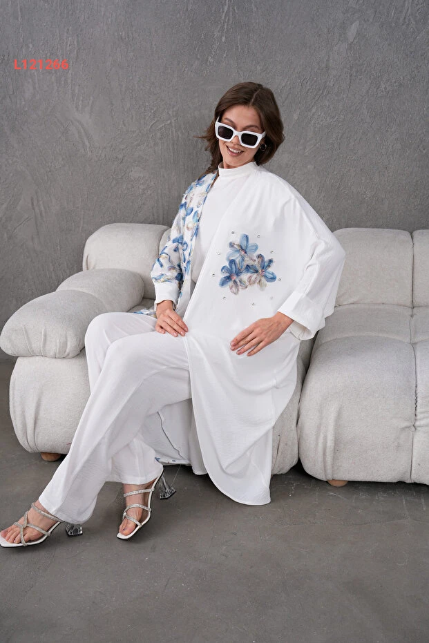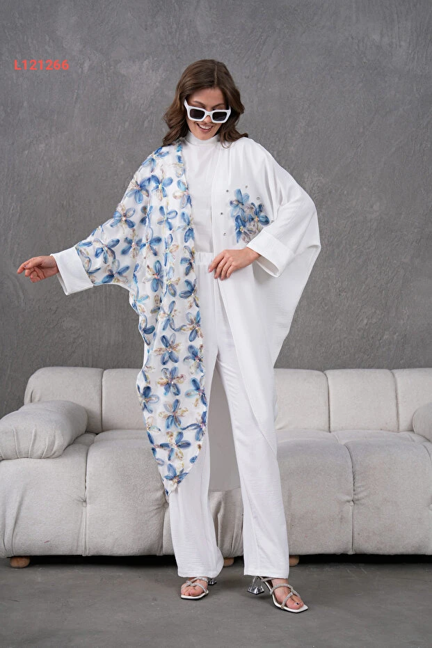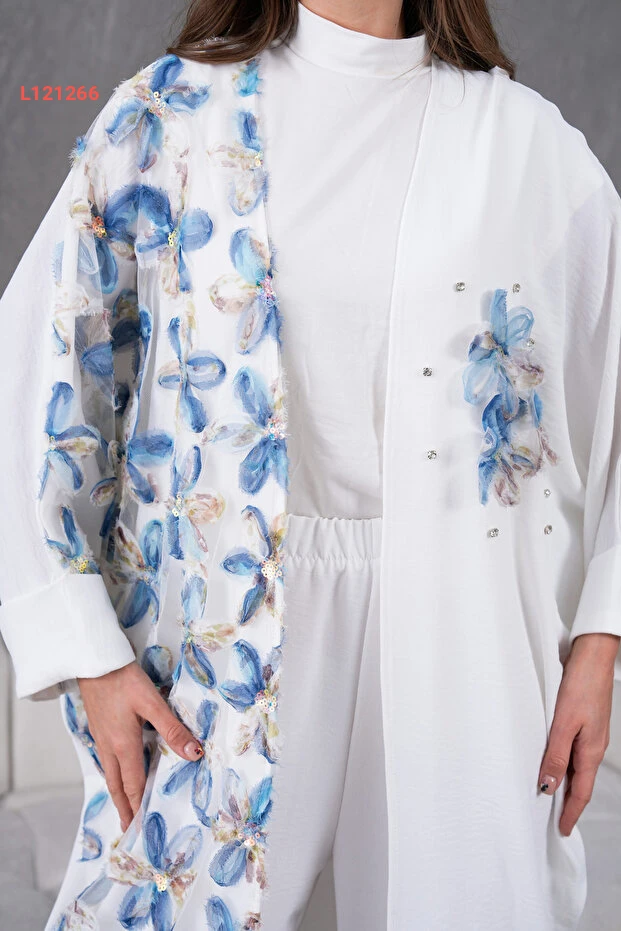 طار الحلم: طقم كيمونو وسروال مزين بتطريز زهور من التول وبتفاصيل الأحجار