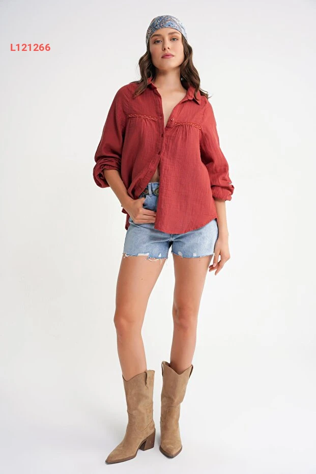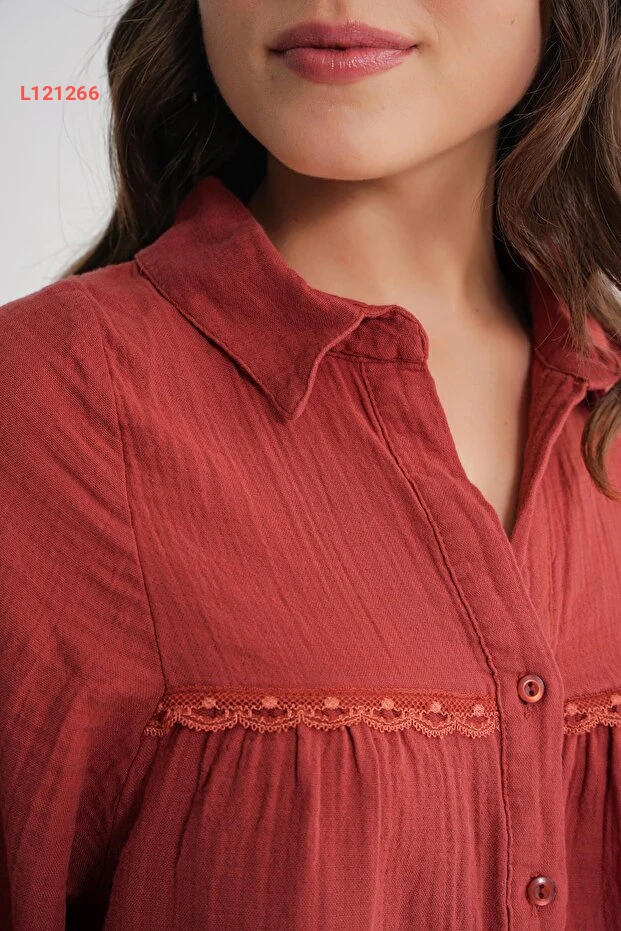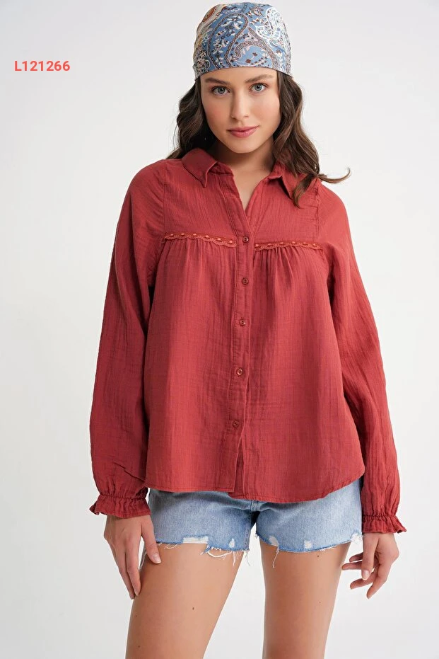 استمتعي بإطلالة أنيقة ومريحة مع قميص Mixray 4677، المصنوع من قماش مسلم الناعم الذي يمنحك حرية الحركة. يتميز بتفاصيل الدانتيل الجذابة التي تضيف لمسة أنثوية لطيفة، مما يجعله الخيار المثالي لكل المناسبات. تألقي بأناقتك مع لون كُزَّيلِك المُشَجَّر الذي يجذب الأنظار!