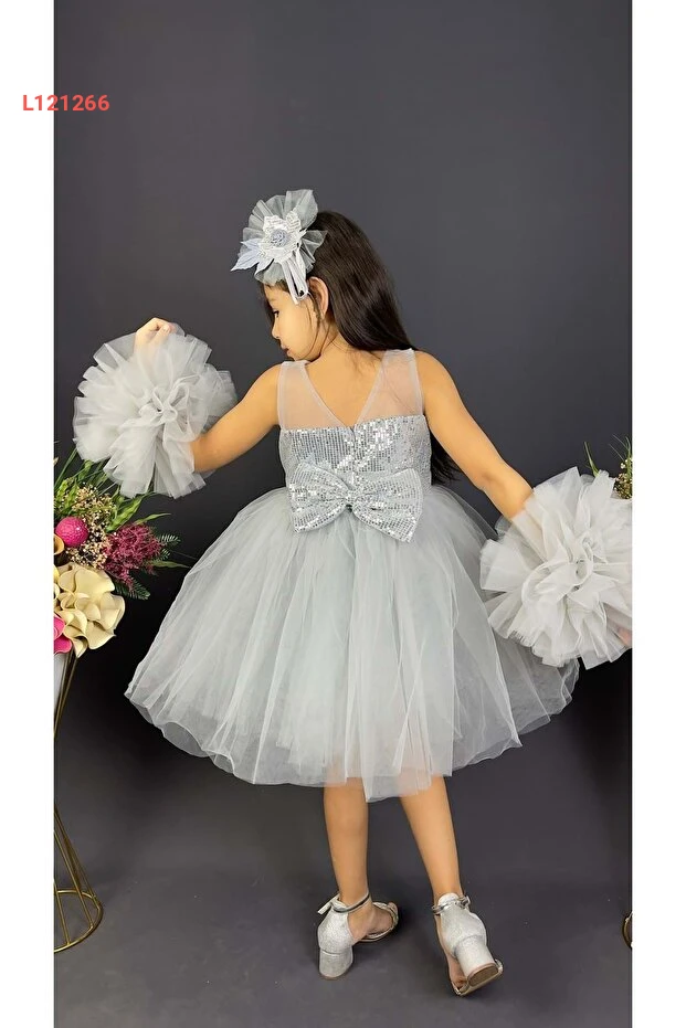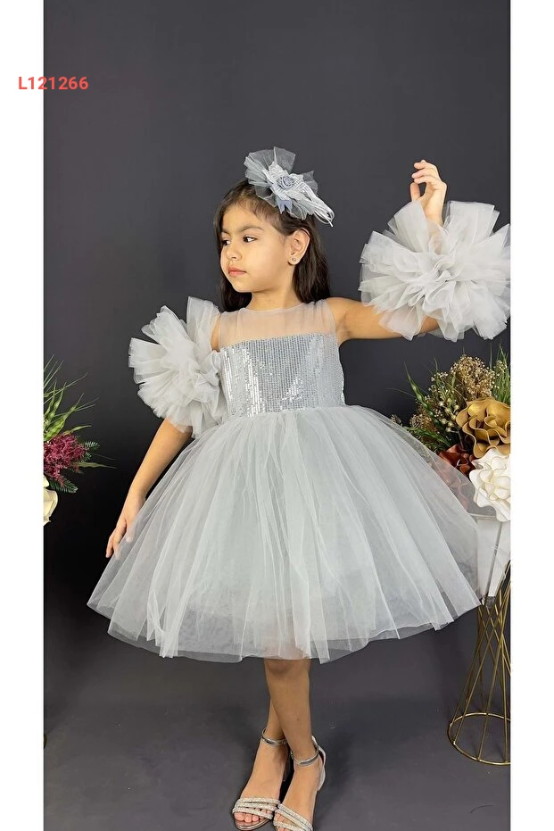 تنورة زفاف فاخرة بناتية بتصميم كشكش من الشيفون مع كرات زينة باللون الرمادي