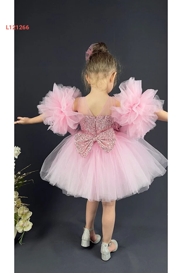 تنورة تفتة للبنات بأكمام مزينة بالخرز وريبا من مانك، لون وردي