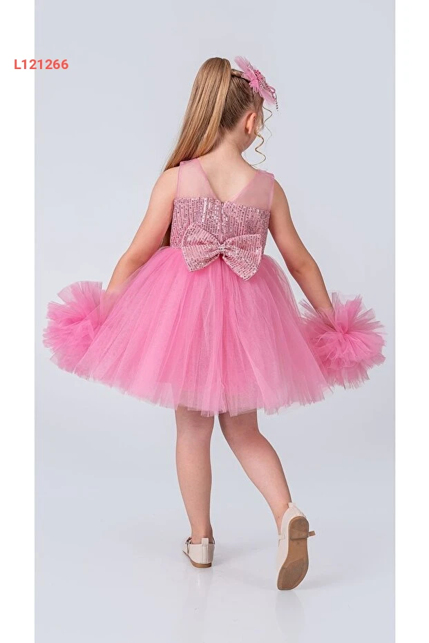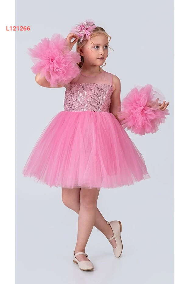 تنانير بنات فاخرة بمزيج من الشيفون والكرات في اللون الوردي السكري