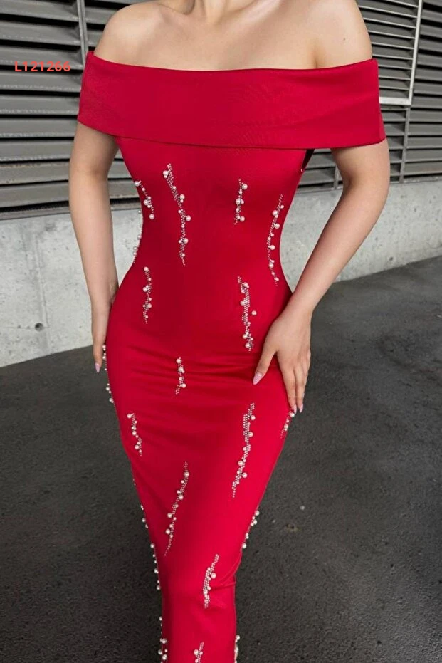 فستان سكوبا حمراء بأكتاف strapless مزين بالأحجار
