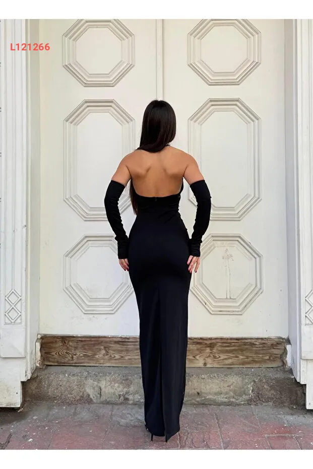 فستان سهره أسود طويل مع أكمام منفصلة بياقة مرتفعة مرصعة بالألماس