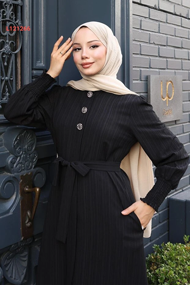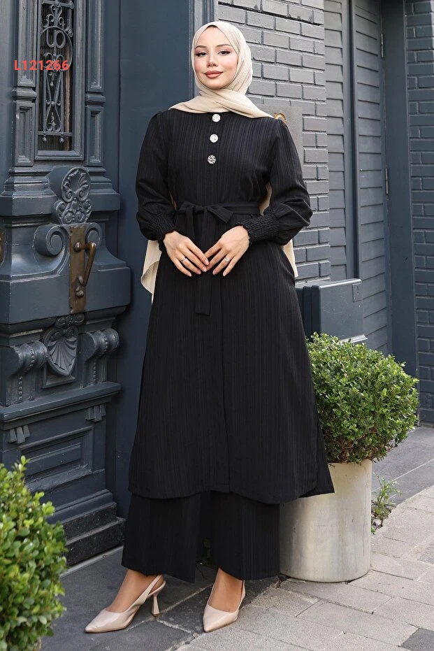 تميز بإطلالة عصرية مع طقم ModaMihram ذو الأزرار، الذي يجمع بين الأناقة والراحة. يأتي بلون أسود جذاب مع حزام يحدد الخصر، مما يضفي لمسة مميزة على مظهرك. جربه اليوم واستمتع بالإطلالة التي تعكس ذوقك الرفيع!