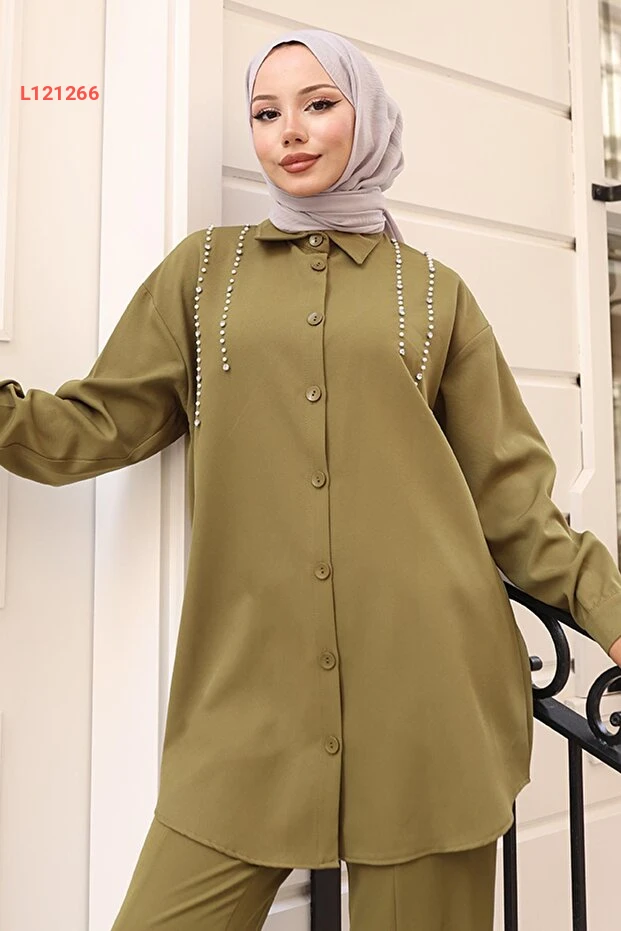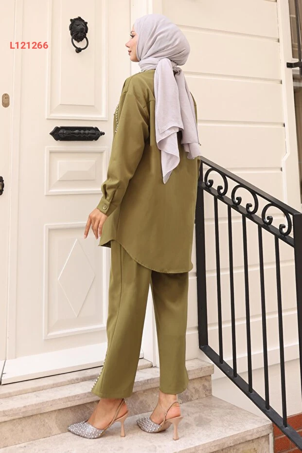 استمتع بإطلالة أنيقة ومميزة مع مجموعة ModaMihram في لون الهاكي الجميل، المتميزة بتفاصيل اللؤلؤ الفاخرة. هذه المجموعة تجمع بين الأناقة والراحة، مما يجعلها خياراً مثالياً لكل مناسبة. ارتديها لتكوني محط الأنظار بأناقتك الفريدة.