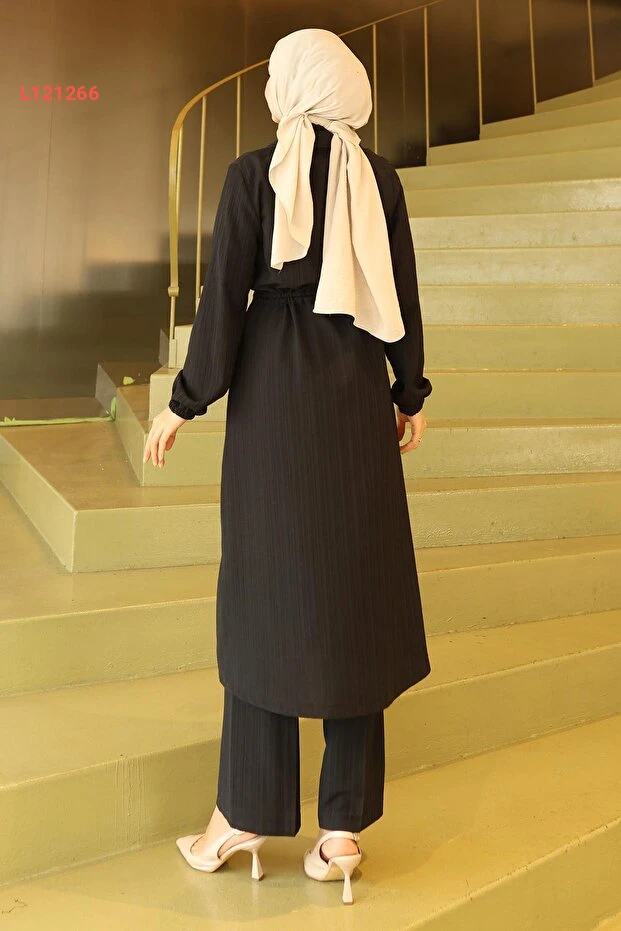 تألقي بأناقتك مع طقم ModaMihram ياقته المصنوعة بتفاصيل الفيرما، حيث يتميز بلونه الأسود الجذاب وقصته العصرية التي تمنحك إطلالة ساحرة ومريحة. يجمع هذا الطقم بين الأناقة والعملية، ليكون الخيار المثالي لكل مناسبة، مما يجعل كل لحظة فرحة تتألقين فيها!