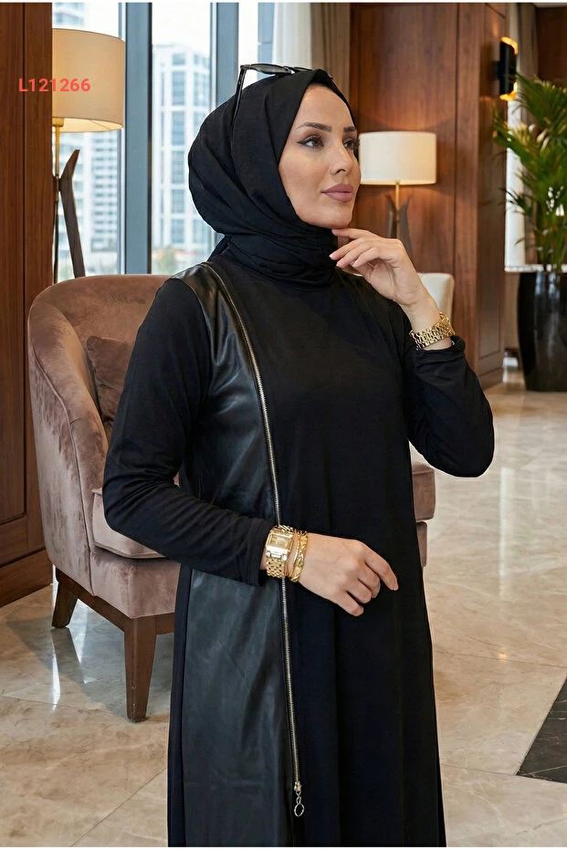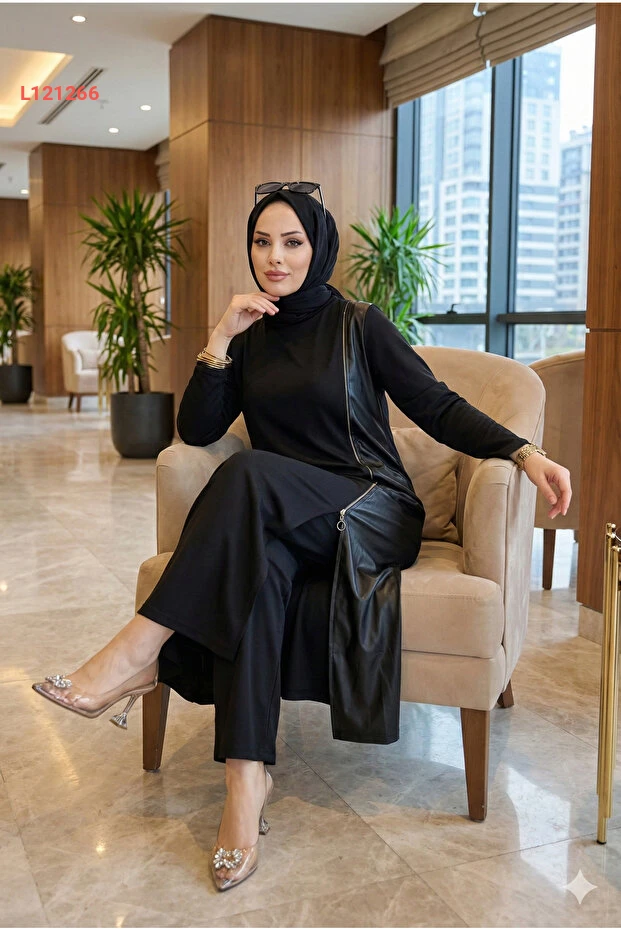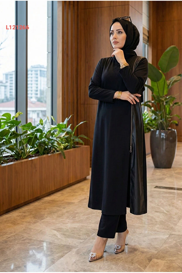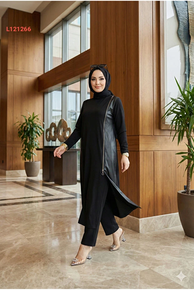 طقم تونيك قطعتين بتصميم عصري من القطن الأسود مع تفاصيل جلدية
