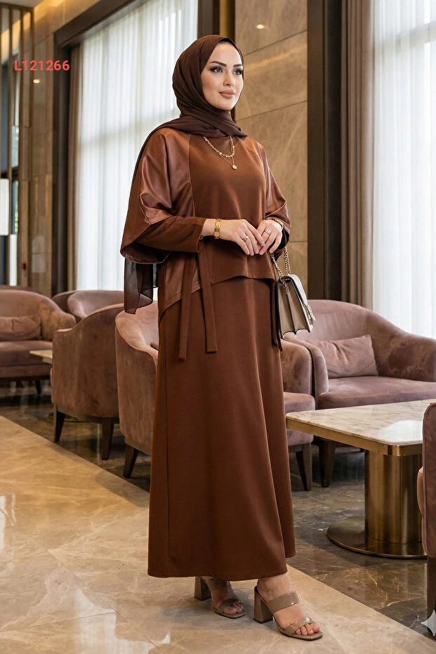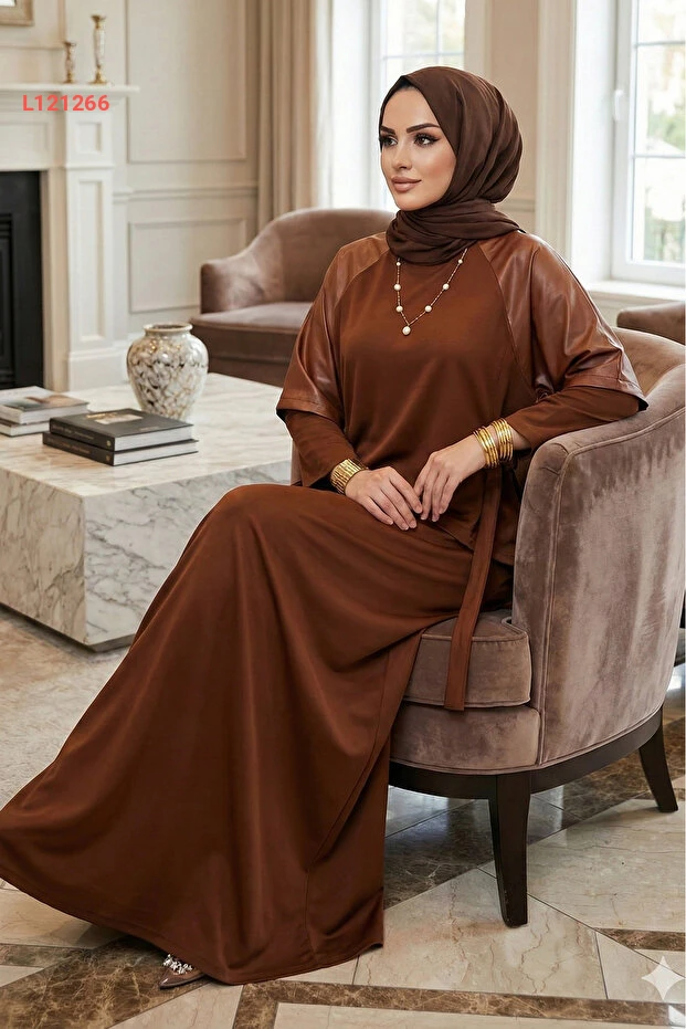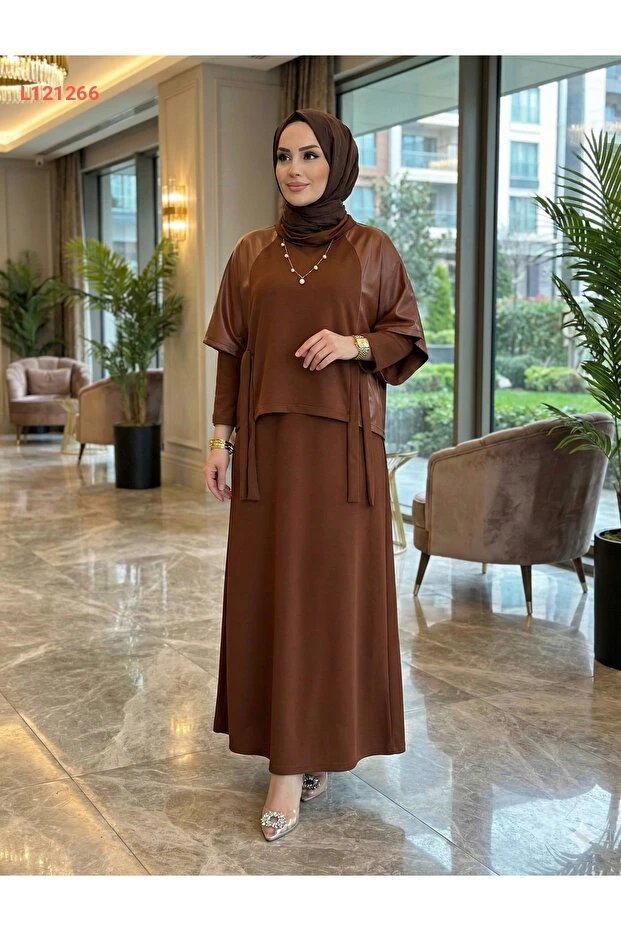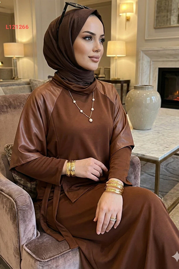 استمتعي بأناقة لا مثيل لها مع فستان "modamira" بتصميمه العصري ولونه البني الدافئ. مصنوع من قماش قطني مريح مع تفاصيل جلدية أنيقة، هذا الفستان المثالي لكل المناسبات يمنحك مظهراً جذاباً يجمع بين الأناقة والراحة. ارتديه مع حجابك المفضل لتظهري بإطلالة متكاملة ومميزة.