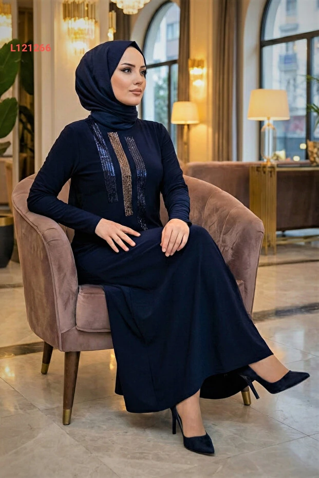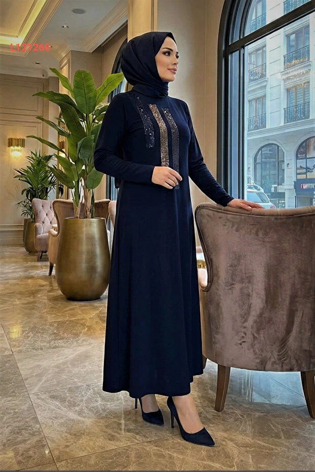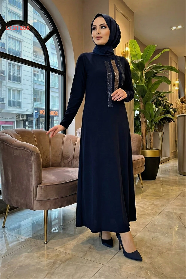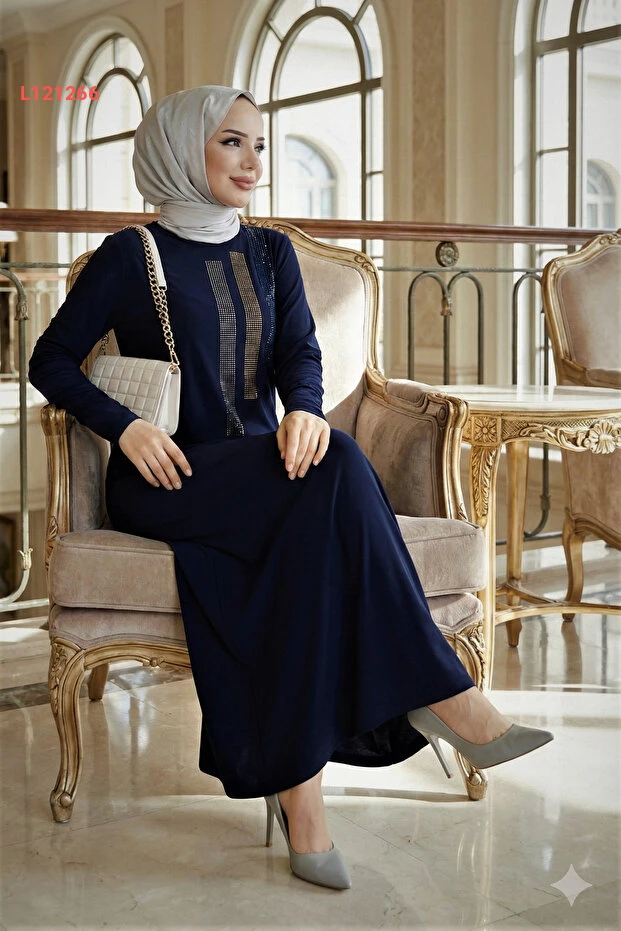 فستان غوزان للتساؤلات الخاصة بالمرأة الشابة بتفاصيل حجرية بلون الكحلي الكبير