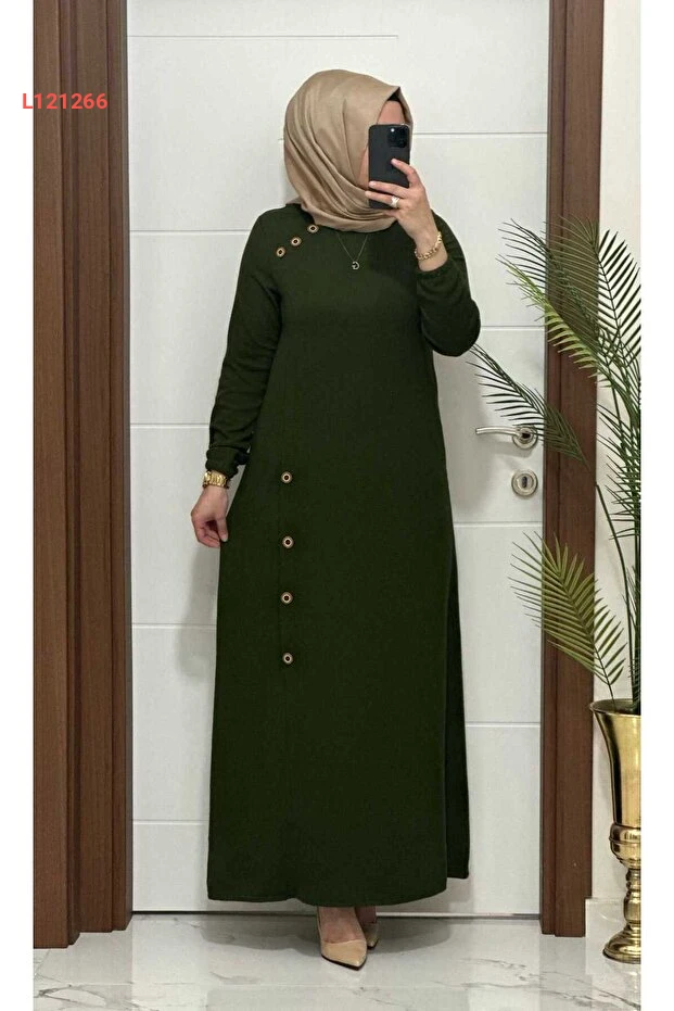 فستان كبير الحجم بكم واسع مزين بأزرار من موداسورا 1777 K 70 بلون هاكي، قماش أطلنطيس مضلّع لموسم جديد