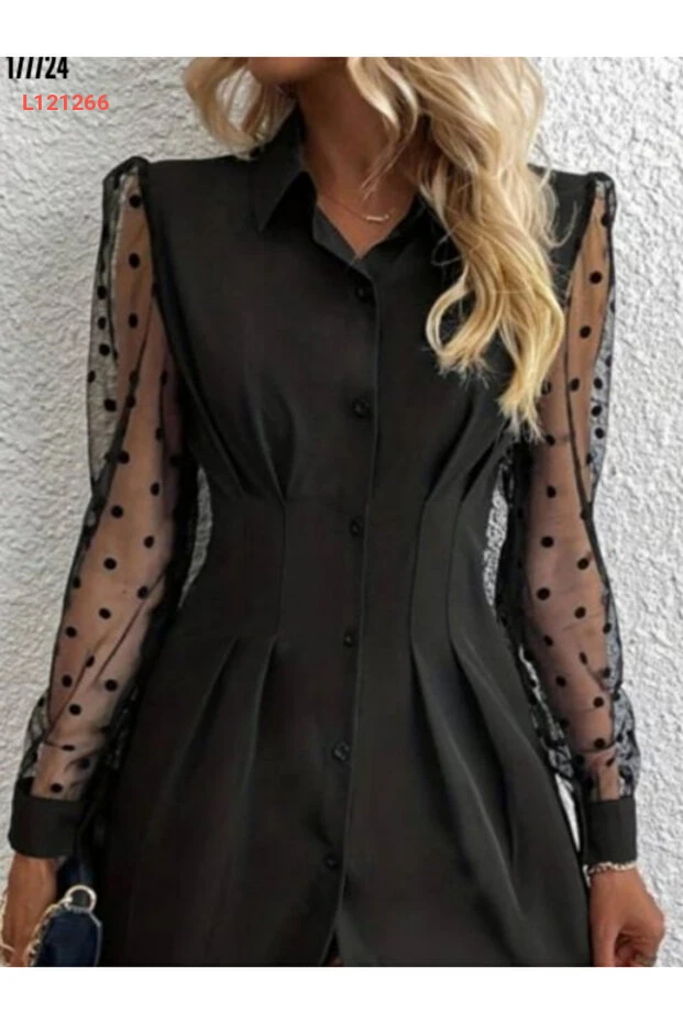 فستان كريب أنيق مزود بأكمام دانتيل قصر وزرّيات - موديل موسم جديد