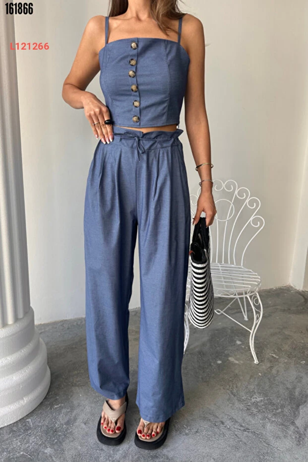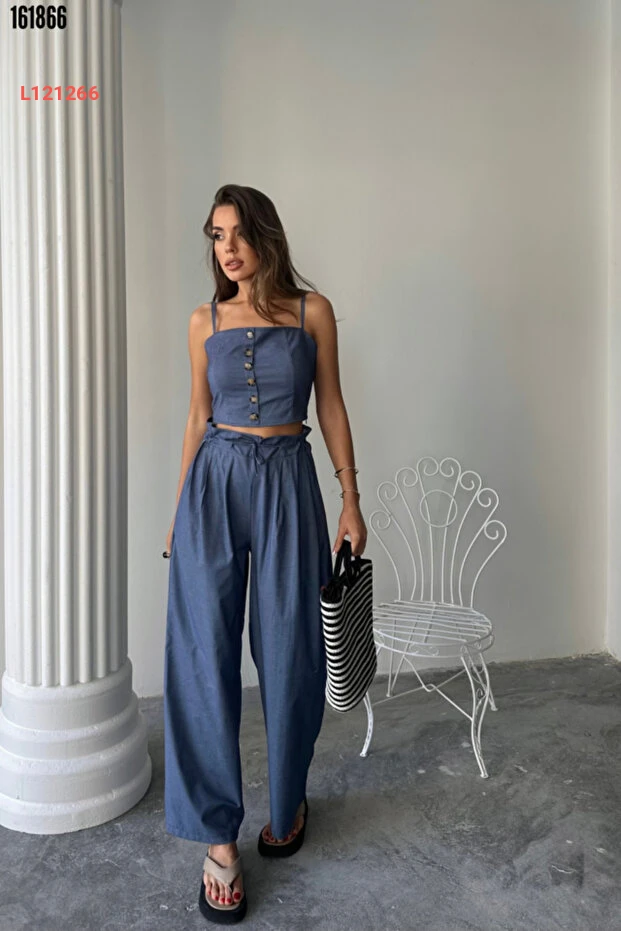 طقم نسائي من بلوزة قصيرة وسروال واسع موضة حديثة