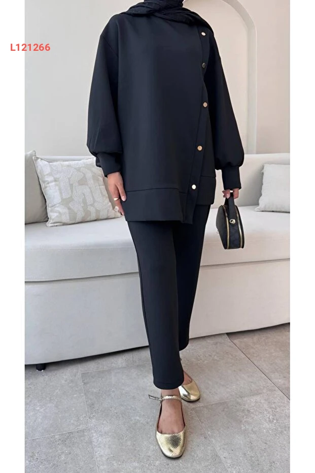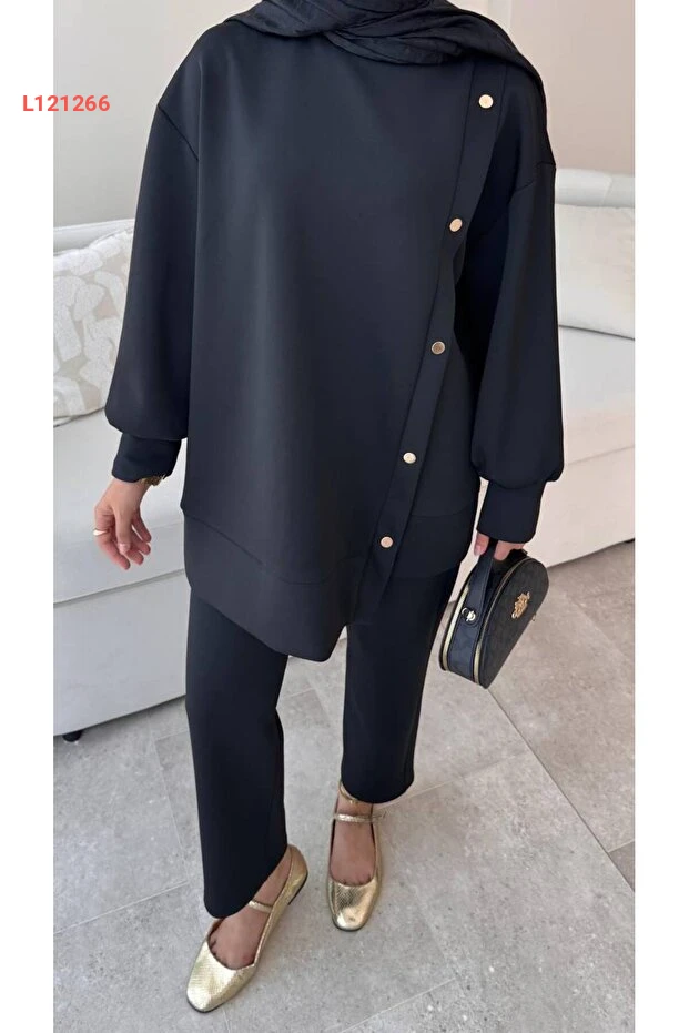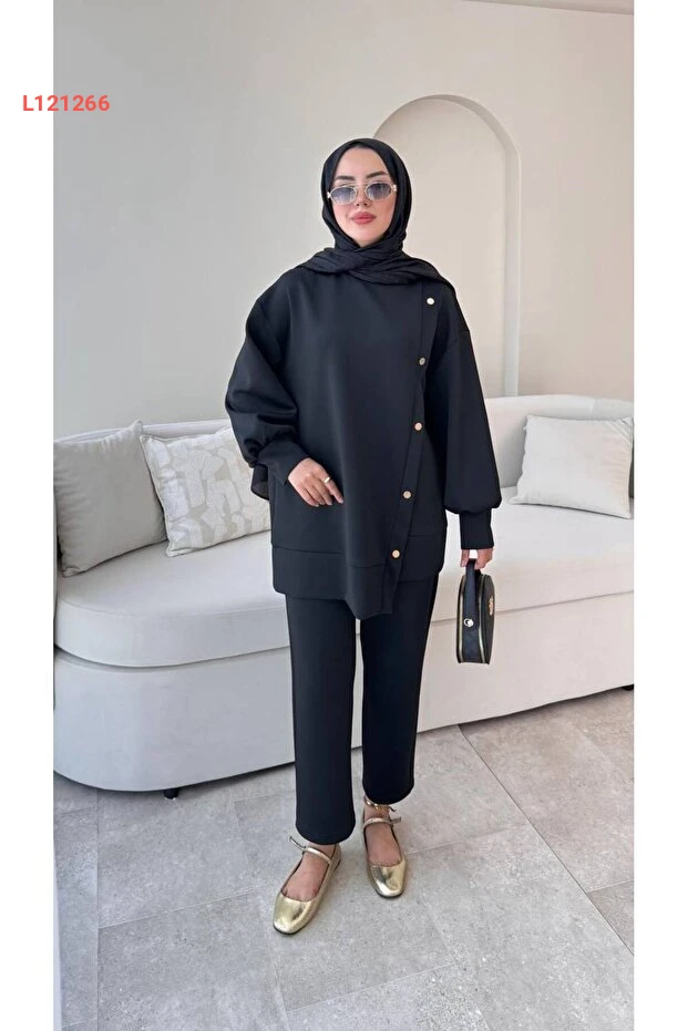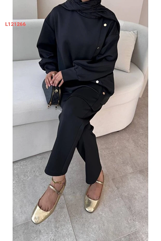 طقم تسهتير نسائي باللون الأسود مع سروال سكوبا مزود بأزرار جانبية