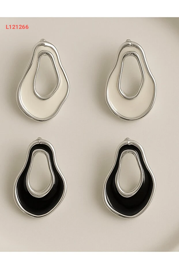 أقراط نسائية فضة بتصميم غير متناسق بلمسة ميناء سوداء/بيضاء - علبة من قطعتين