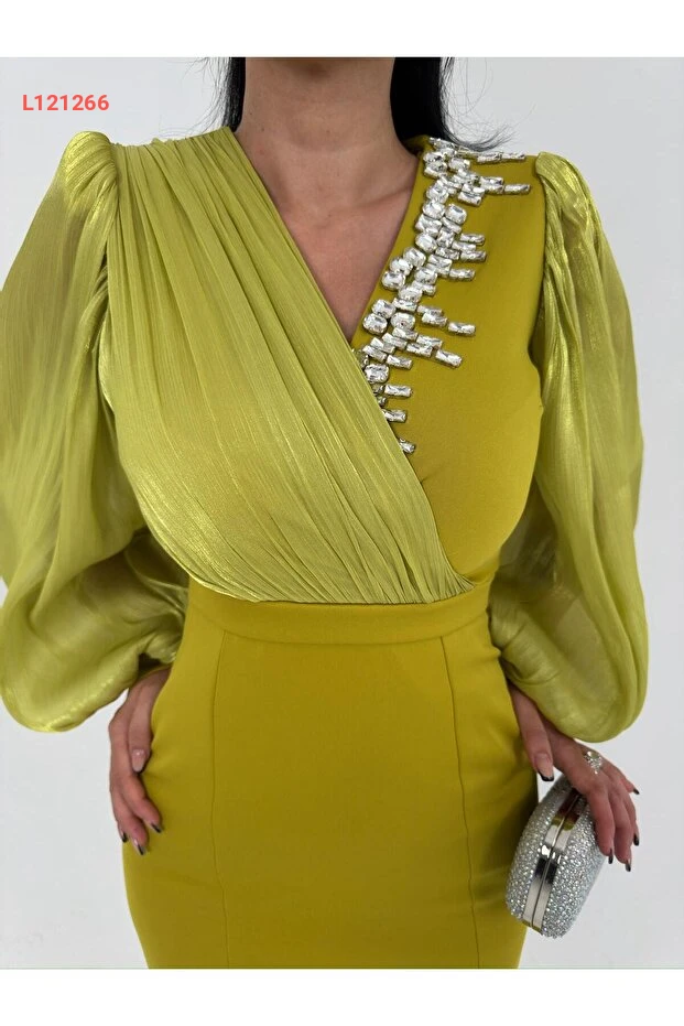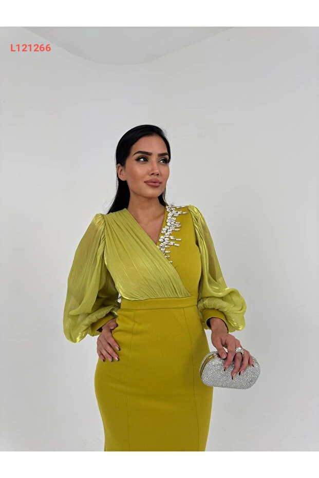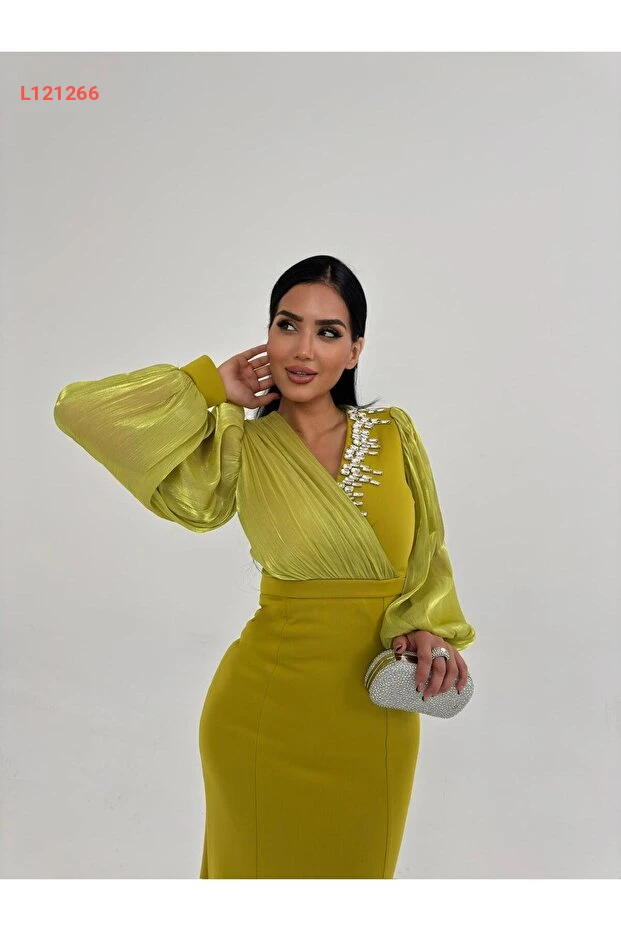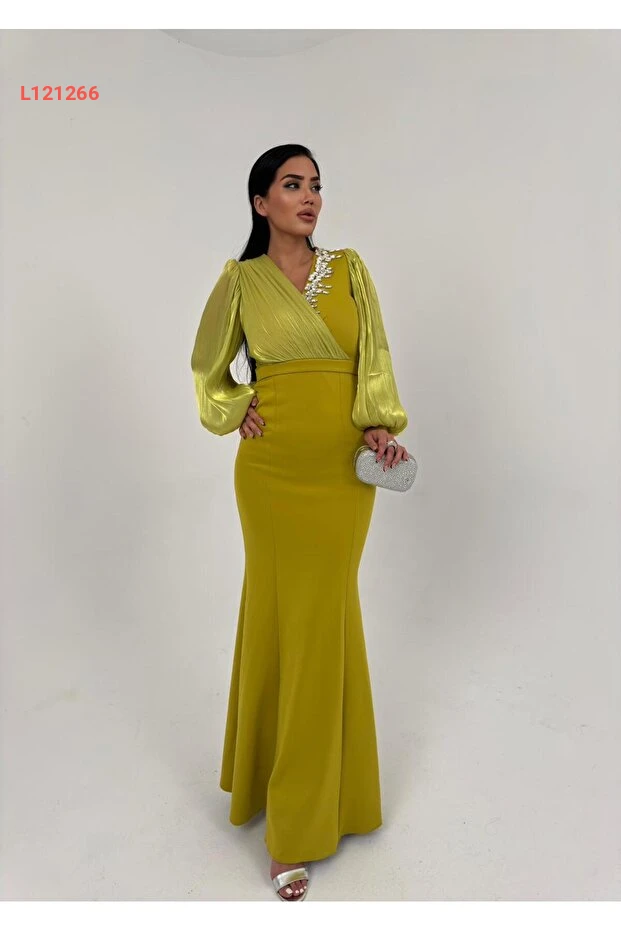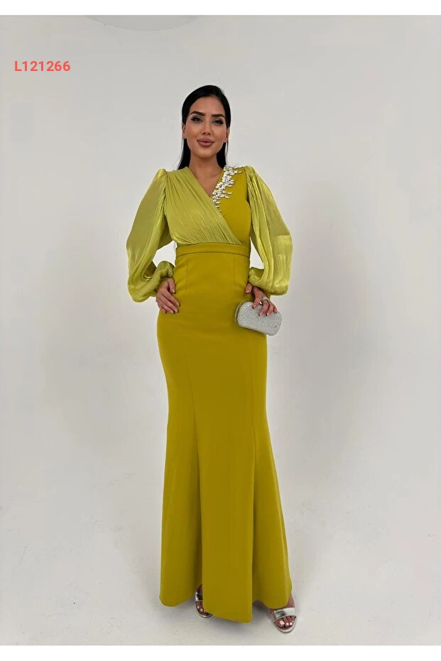 فستان سهرة طويل شيفون مزين بالتفاصيل اللامعة عند الأكمام والصدر من Monchoix