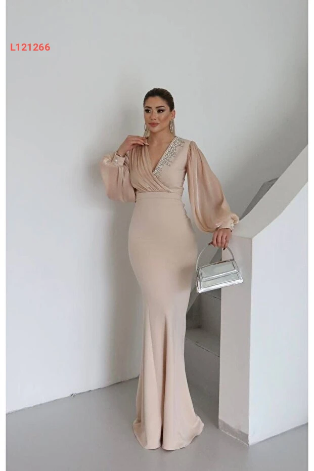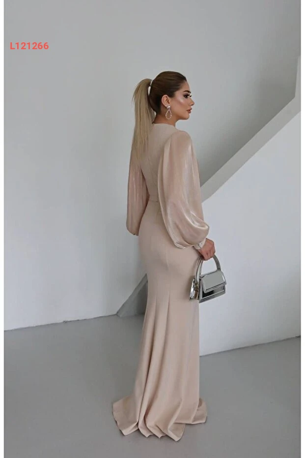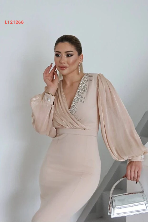 فستان سهرة طويل بتفاصيل لامعة وأكمام وشيفون متقاطع للنساء من مونشواكس