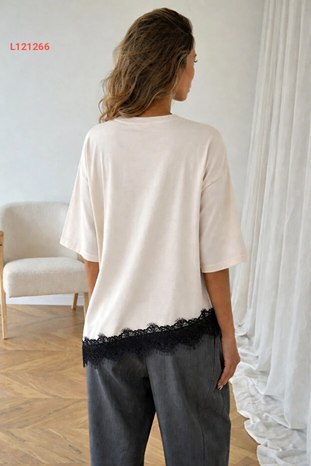تي شيرت مزين بتفاصيل دانتيل مع تصميم غير متماثل للنساء - مثالي للاستخدام اليومي