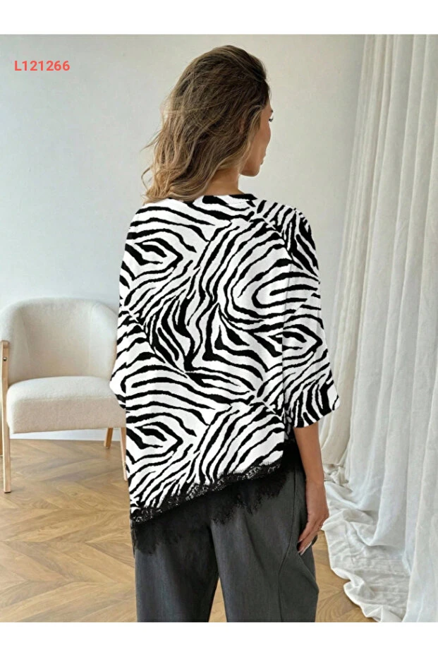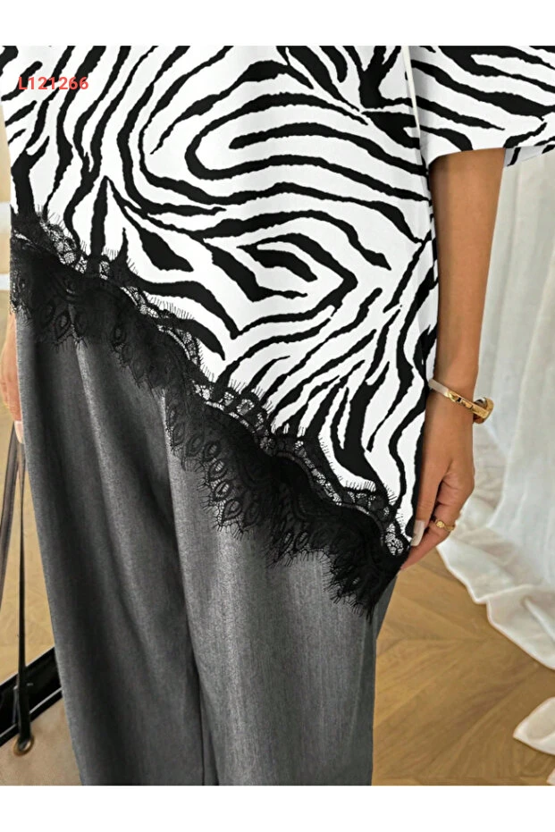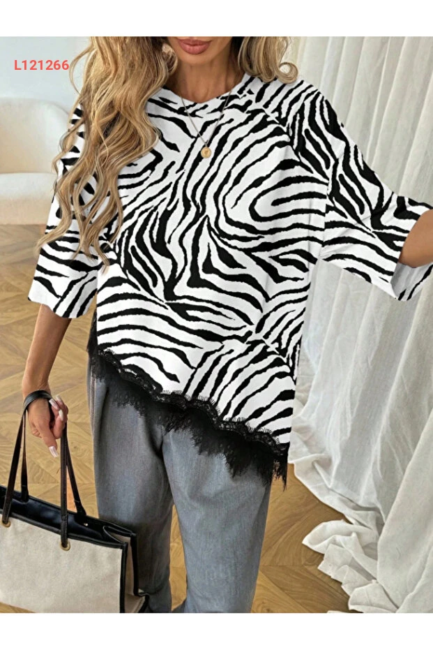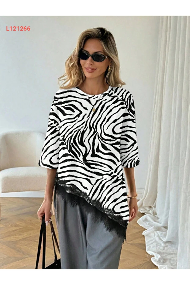 تي شيرت يومي مزين بتفاصيل الدانتيل وزي أسيمترى للنساء