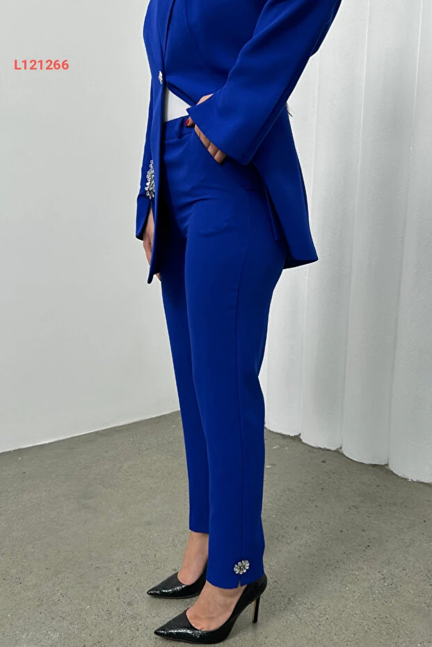 مجموعة مُتنوعة من تصميم أنيق: بدلة نسائية بنمط جاكيت بتفاصيل ماسية وسروال ضيق