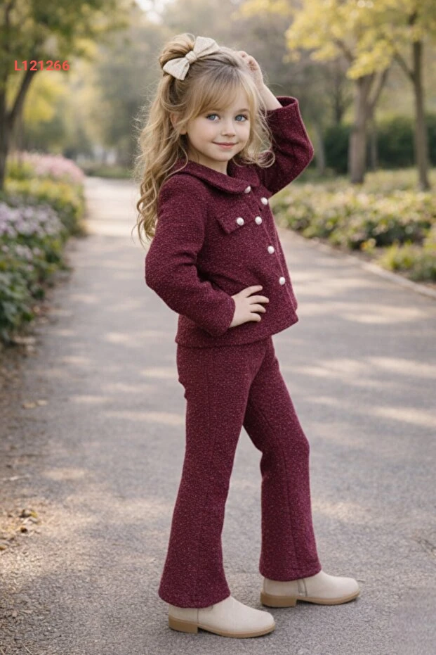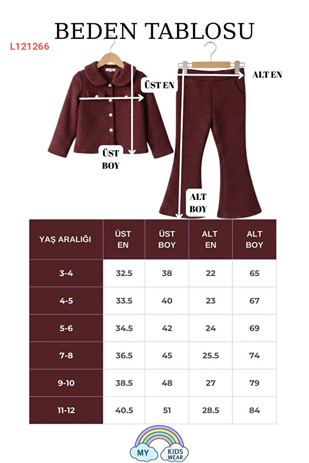 اجعل ابنتك تتألق في المناسبات مع طقم Bayramlık من My Kids Wear! يتضمن هذا الطقم الجميل جاكيت من قماش التويد الأنيق وسروال بقدمان إسبانيين، مما يوفر مزيجًا مثاليًا من الراحة والأناقة. مثالي للاحتفالات والمناسبات الخاصة، سيلفت أنظار الجميع بفضل تصميمه العصري وجودته العالية.