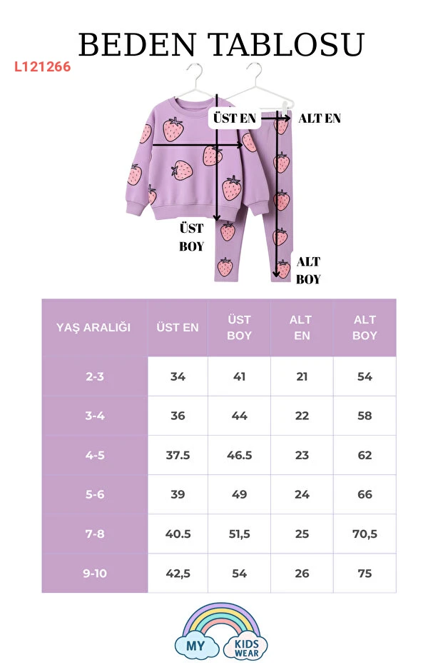 استمتع بأناقة لا مثيل لها مع طقم My Kids Wear لتنكر البنات، الذي يتضمن سويت شيرت مطبوع بتصميم الفراولة الجذاب مع بنطال ملائم. مصمم من ثلاث طبقات لتوفير الدفء والراحة، سيجعل هذا الطقم صغيرتك تبدو رائعة وتستمتع بحرية الحركة في كل مغامراتها. مناسب للفتيات من عمر 2 إلى 10 سنوات، فهو الخيار المثالي لأيام اللعب والمرح!