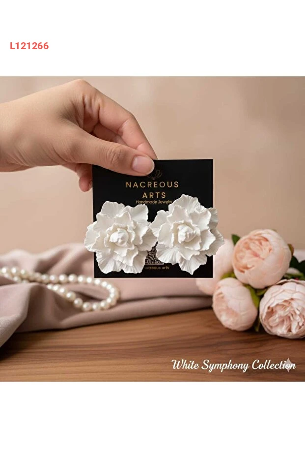 استمتعي بسحر وجمال أقراط Nacreous Arts White Symphony Maxi Çiçek، التي تتميز بتصميمها الفريد المصنوع يدويًا من البوليمر. تضمن لك هذه الأقراط البيضاء الأنيقة إطلالة مميزة مناسبة لكل المناسبات، حيث تضيف لمسة من الجمال البوهيمي لمظهركِ كعروس أو في أي احتفال خاص.