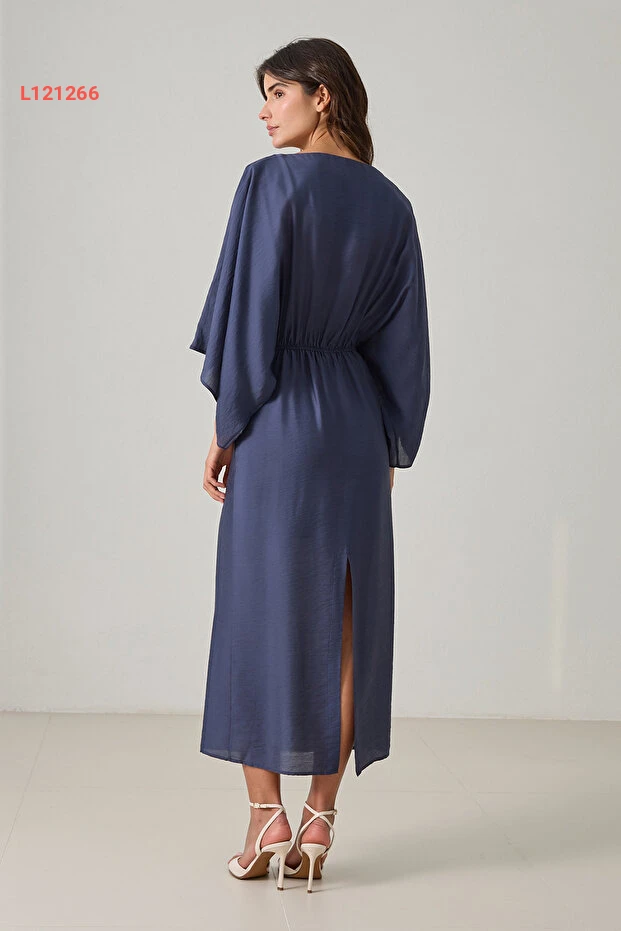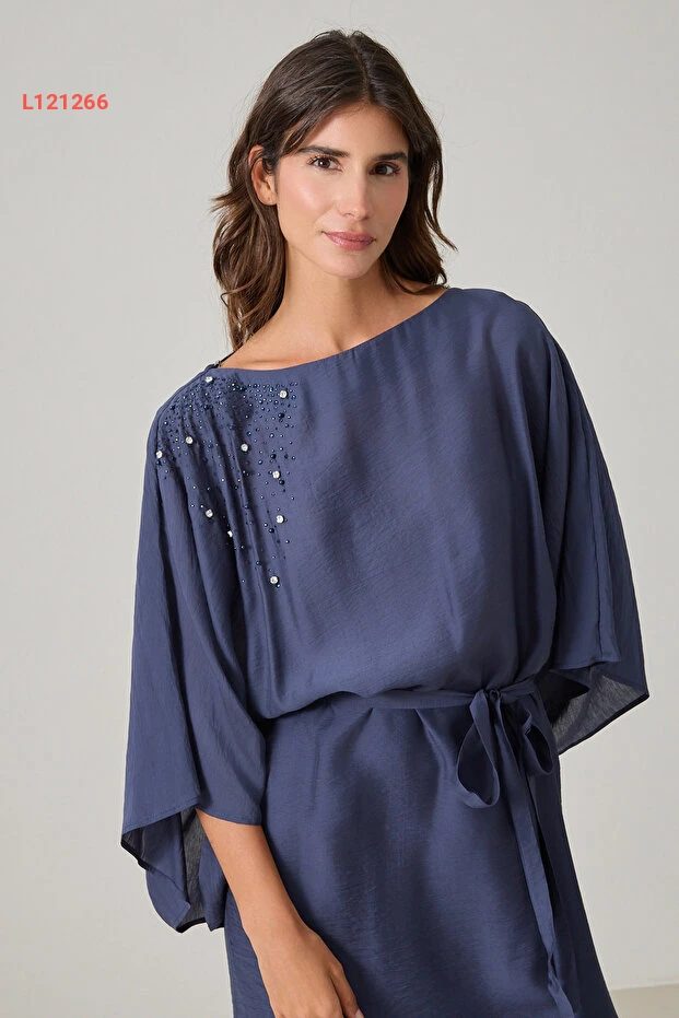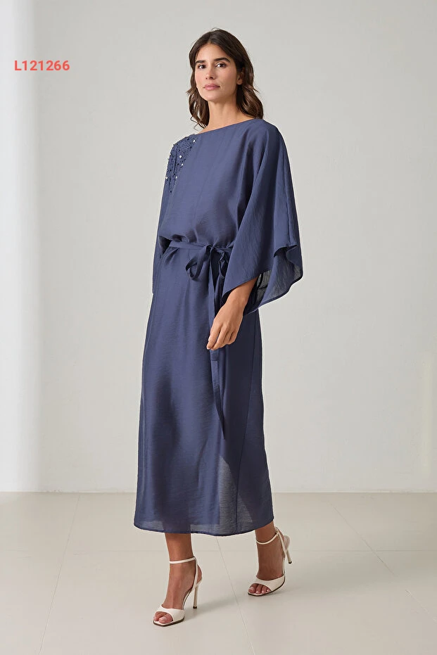 فستان متوسط الطول بالأكمام الطويلة وبحزام عند الخصر، بلون أزرق داكن مع تفاصيل على الكتف